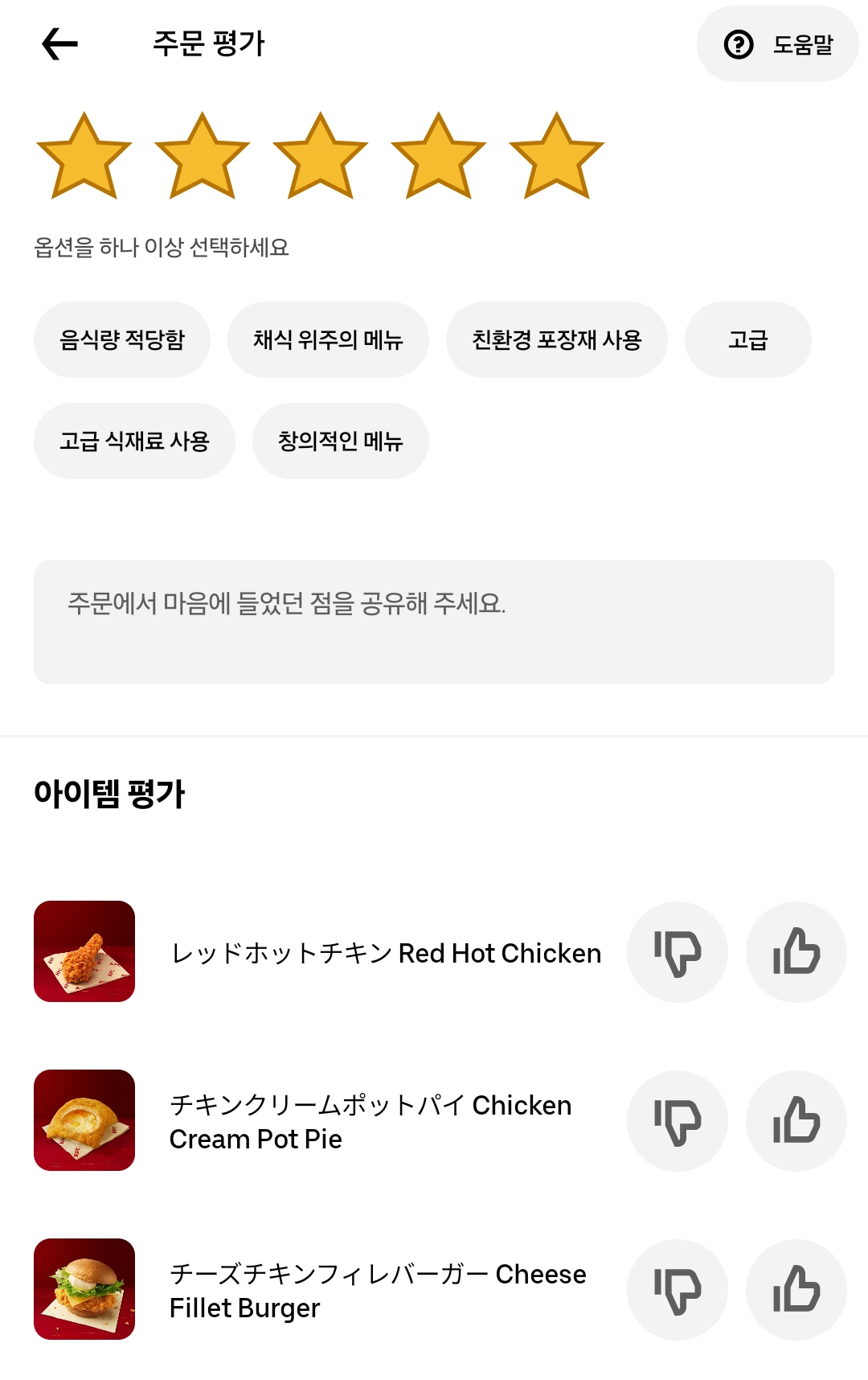 치킨 하나, 크림 파이 하나, 버거 하나 시켰는데