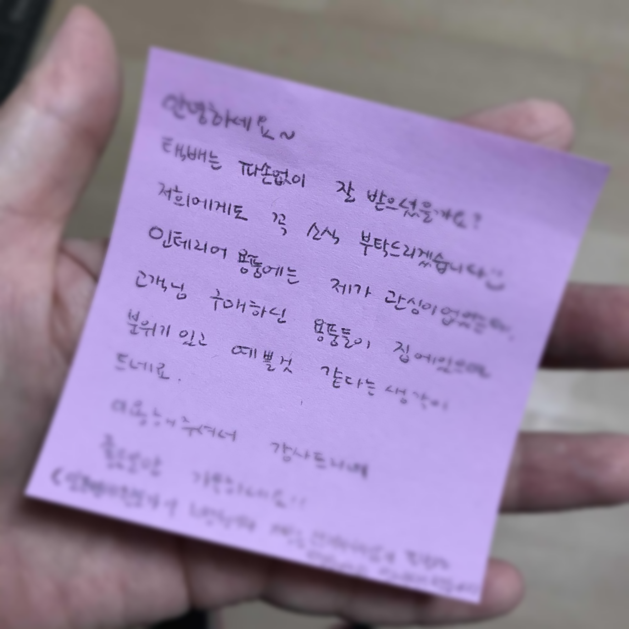 그리고 EMS 보내 주신 우체국 직원 분의 따뜻한 글씨체로 쓰여진 쪽지. 요즘 인테리어 소품에 관심이 많아서 오늘의 집 사이트도 많이 보고, 유투브 중에서 집 꾸미기도 많이 봤다. 나는 왕 똥손이지만, 그래도 이것 저것 보다 보니까 아주 조금이라도 센스가 자라고 있다.