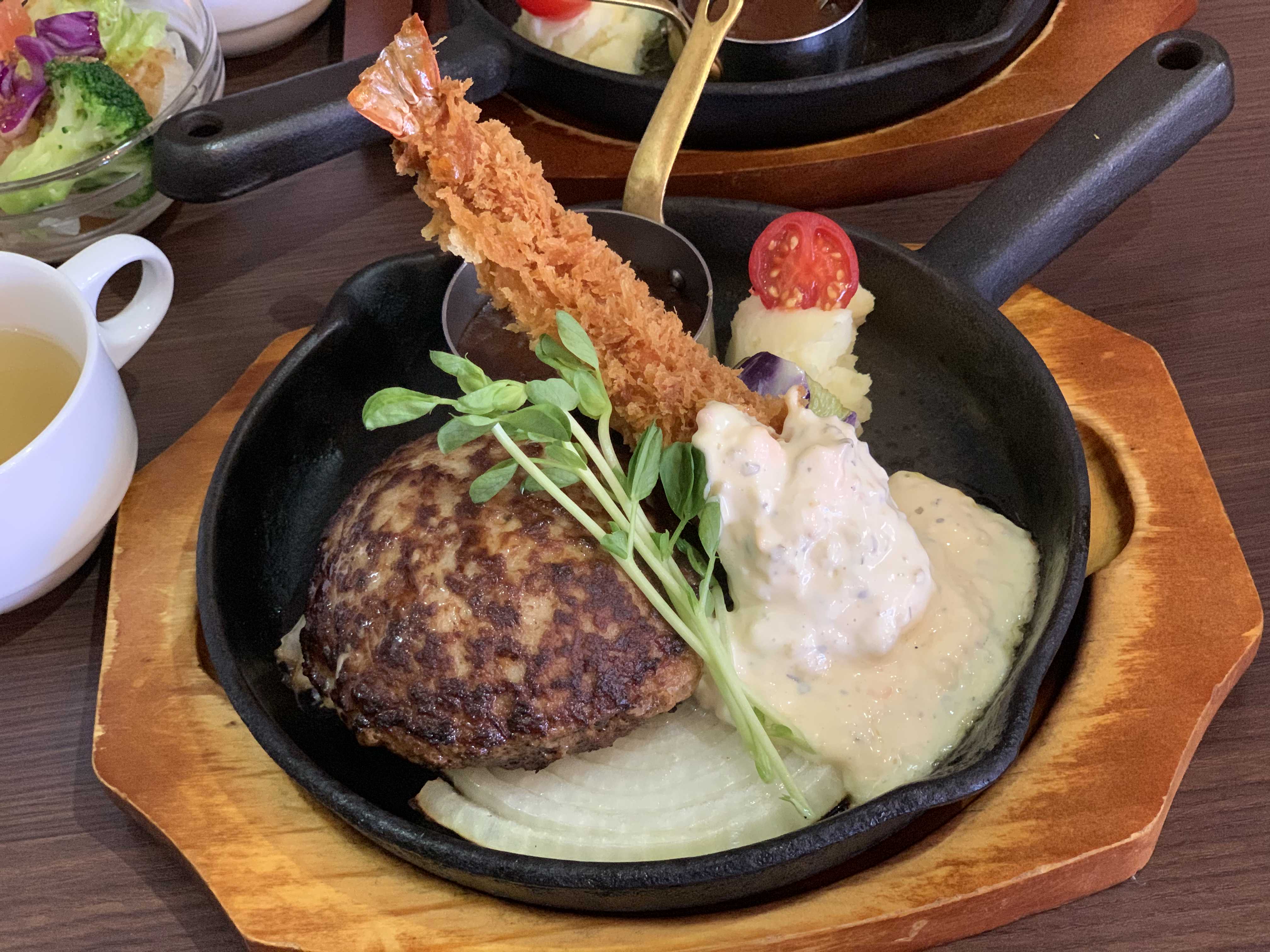 남자친구가 주문한 새우튀김이 포함된 함바그 메뉴. 새우튀김은 정말 크고 새우도 탱탱하고 맛있다. 튀김옷은 조금 딱딱하긴 했는데, 타르타르 소스를 듬뿍 묻혀 먹으면 맛있게 먹을 수 있었다.