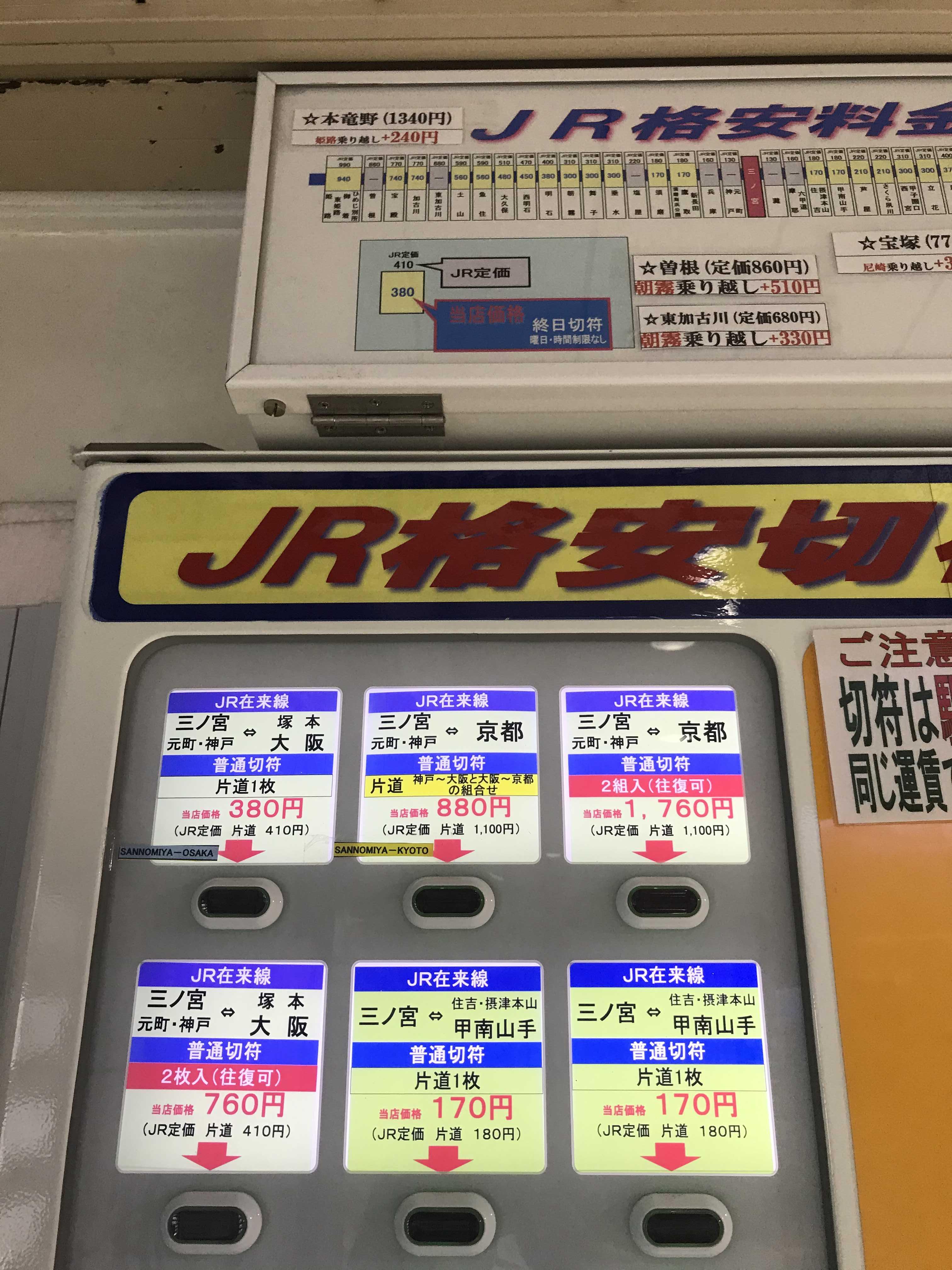 산노미야 전철 지하에 위치한 티켓 판매기. 이렇게 자판기 형태로 된 것도 있고, 역 밖으로 나가면 여러 티켓 판매소에서 JR 티켓이나 신칸센 티켓들을 정가보다 저렴하게 판매한다. 여러군데 돌아다니다 보면 10엔 정도 차이가 나는 경우가 있어, 돌아다니면서 가격을 비교 해보는 것도 좋다.