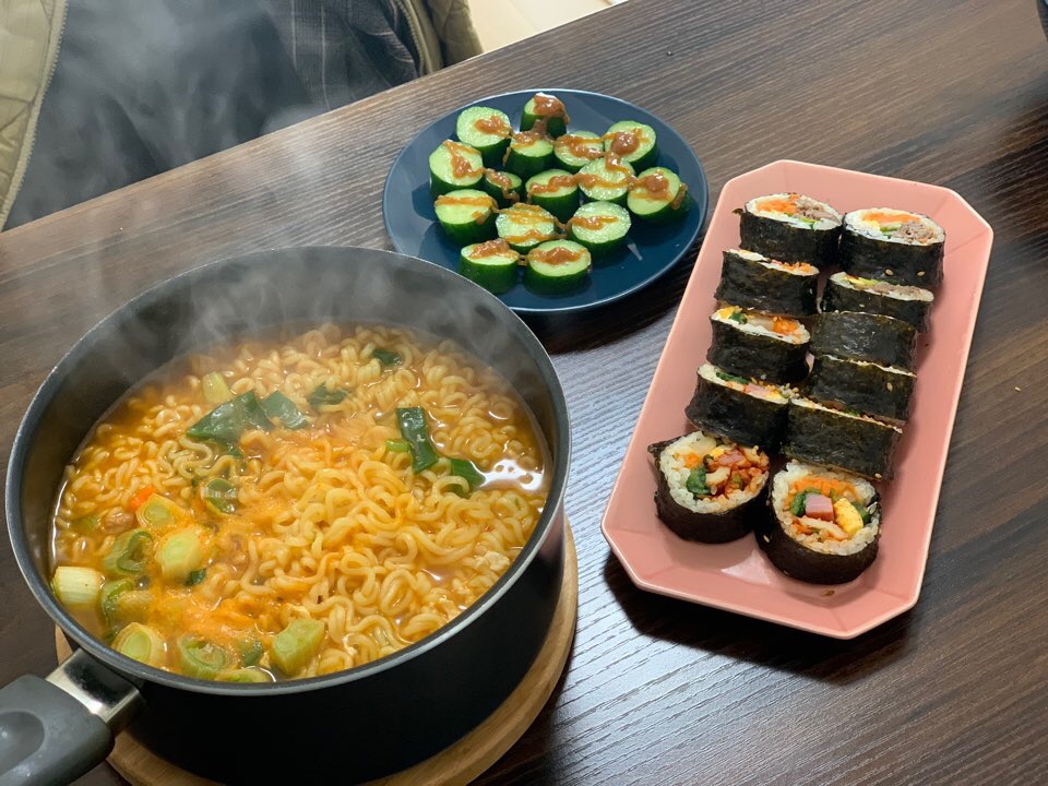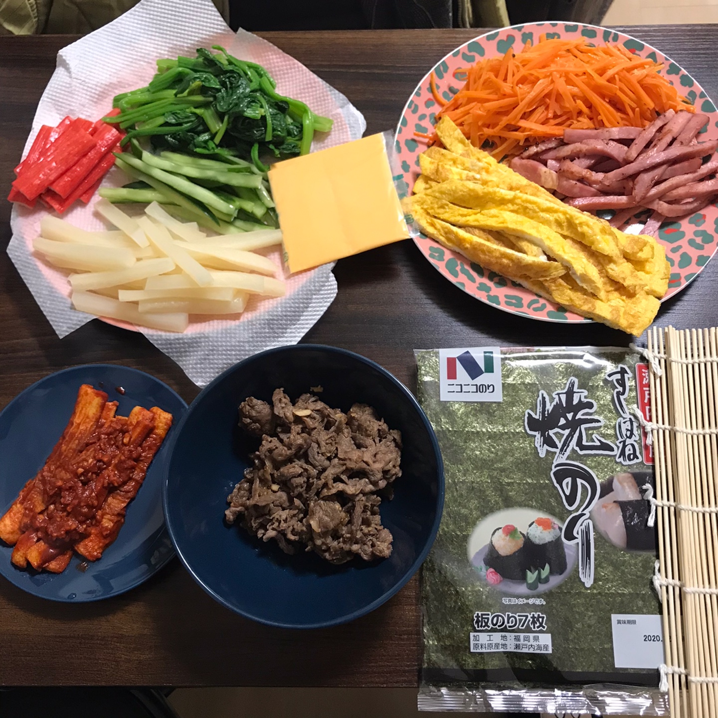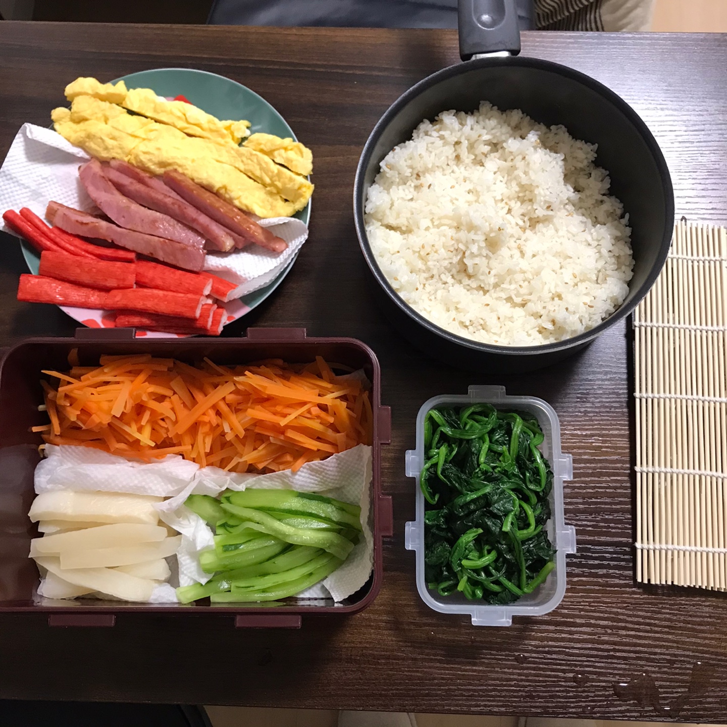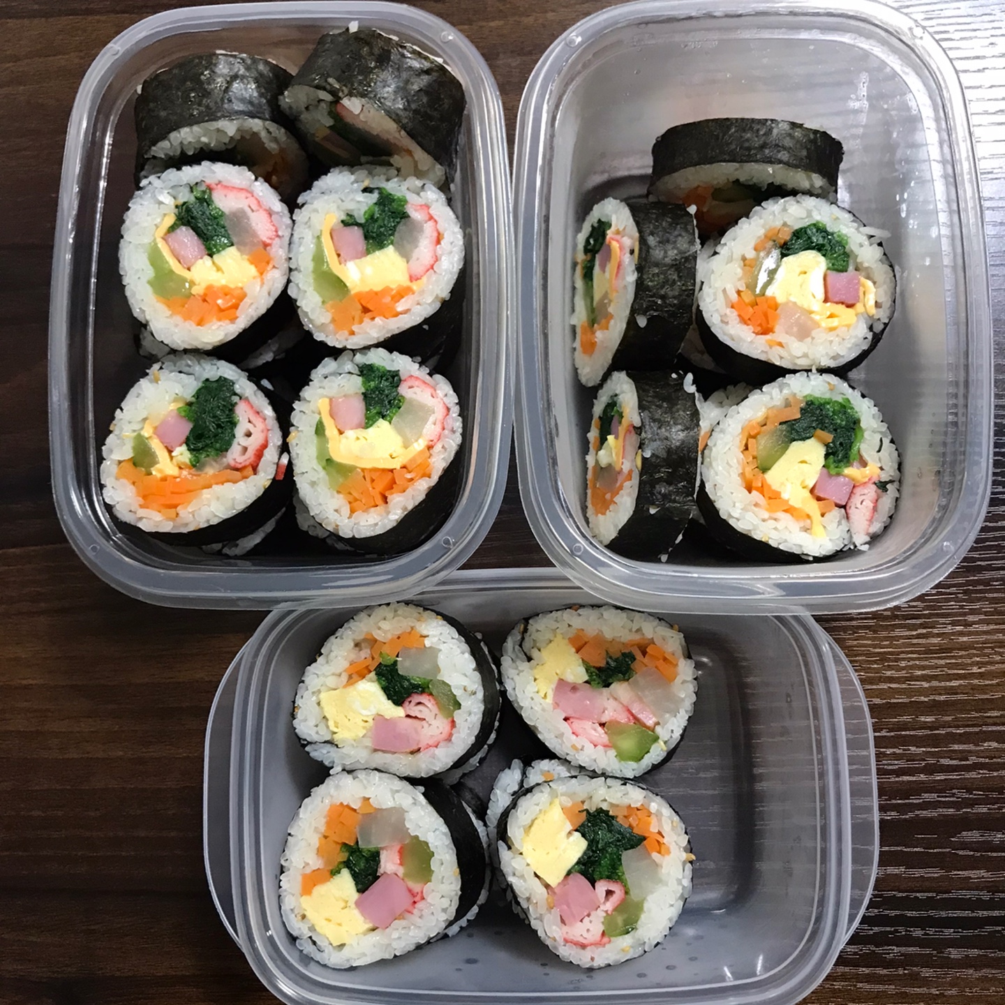 손이 많이 가기 때문에 한국에서도 분식집에서 사먹을 뿐 직접 만드는 일은 없었는데 일본에서는 김밥먹기가 힘들어 도전했다. 일본에서 구할 수 있는 재료로 만든 한국 김밥.