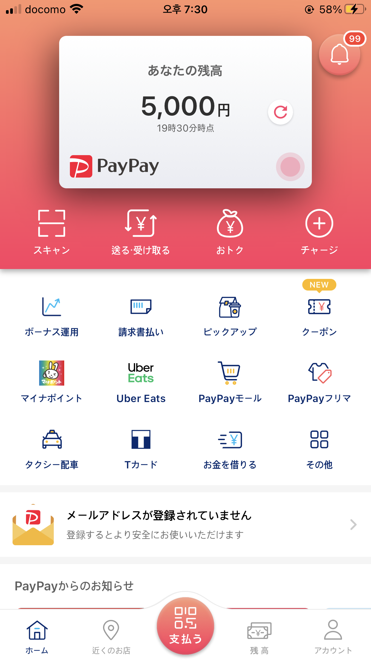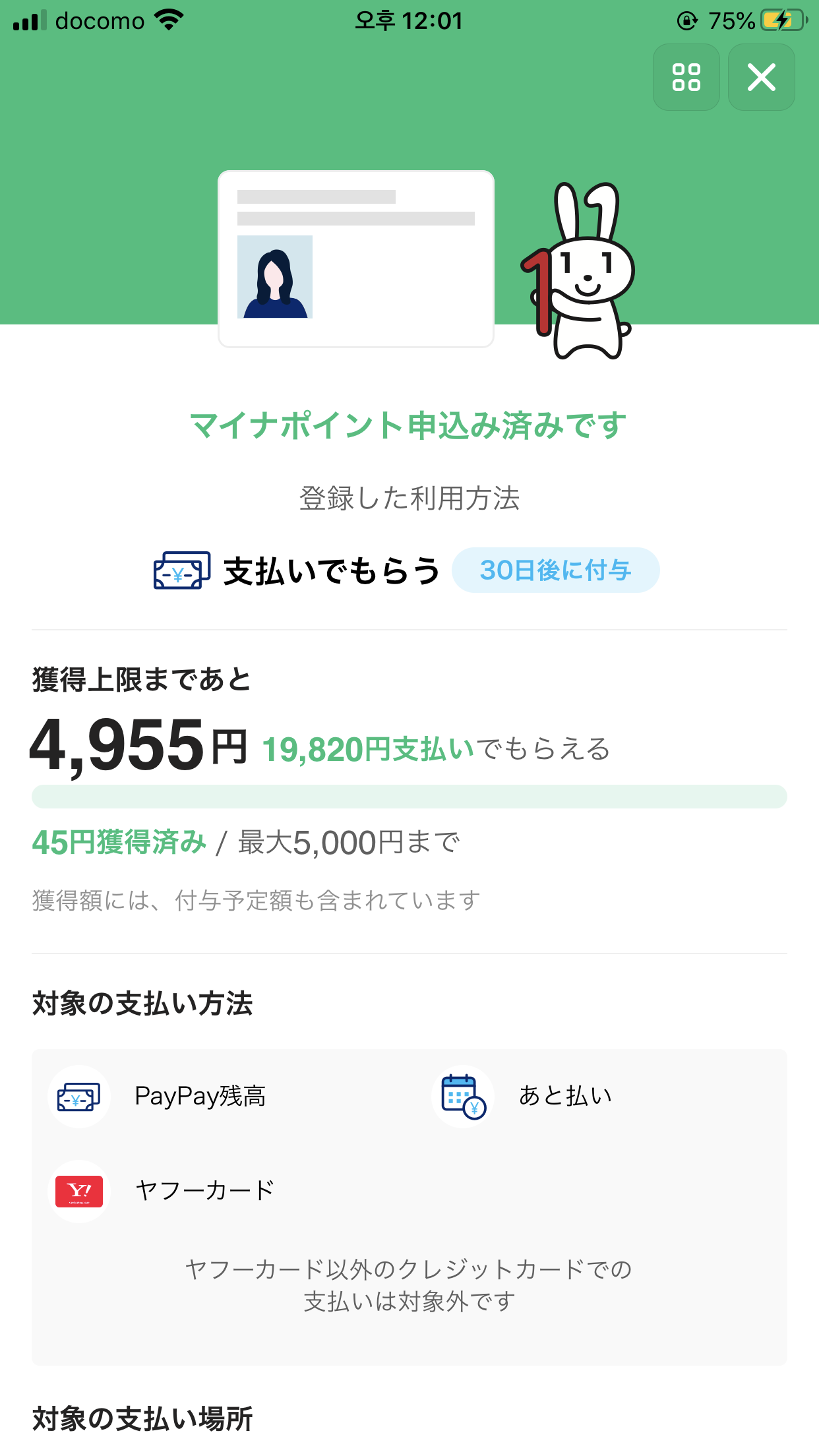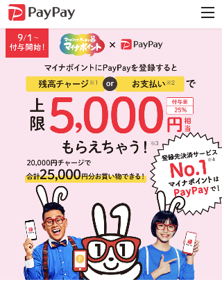 나는 평소에 페이페이를 자주 사용하기 때문에 페이페이로 마이너포인트를 받으려고 신청했다. 5000엔을 그냥 주는 것은 아니고, 20,000엔을 충전 チャージ 하거나 충전 후 사용하면 포인트로 돈이 들어오고, 최대 5000엔을 받아서 평소에 전자머니 쓰듯 현금처럼 사용 가능하다.