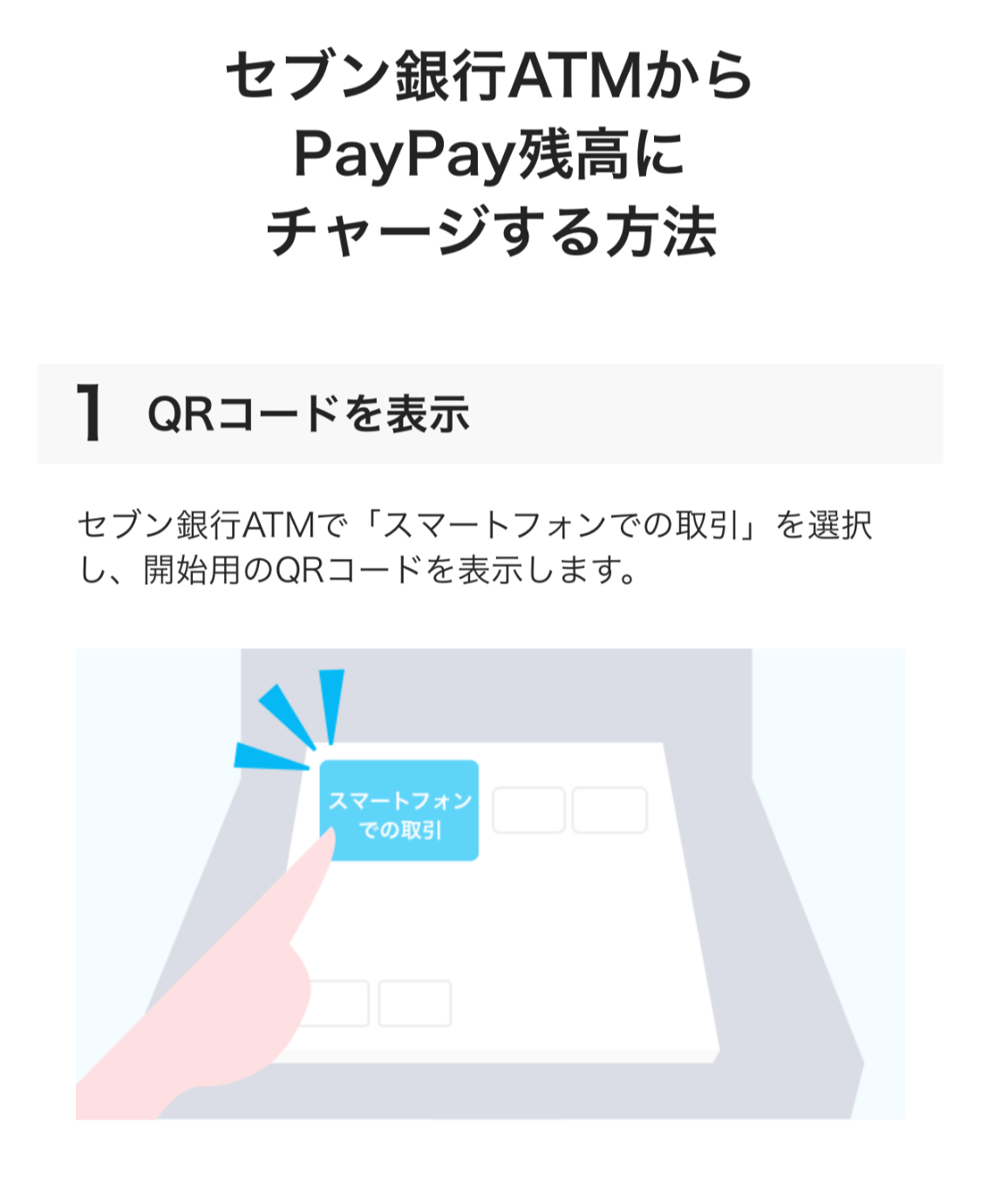 그래서 나는 다른 방법을 찾아보다가 페이페이 편의점 입금을 하게 되었다. 세븐일레븐 은행에서 스마트폰 거래 선택한 후 페이페이 어플에 있는 QR코드를 읽으면 충전이 가능하다. 방법은 어렵지 않아서 금방 할 수 있다.