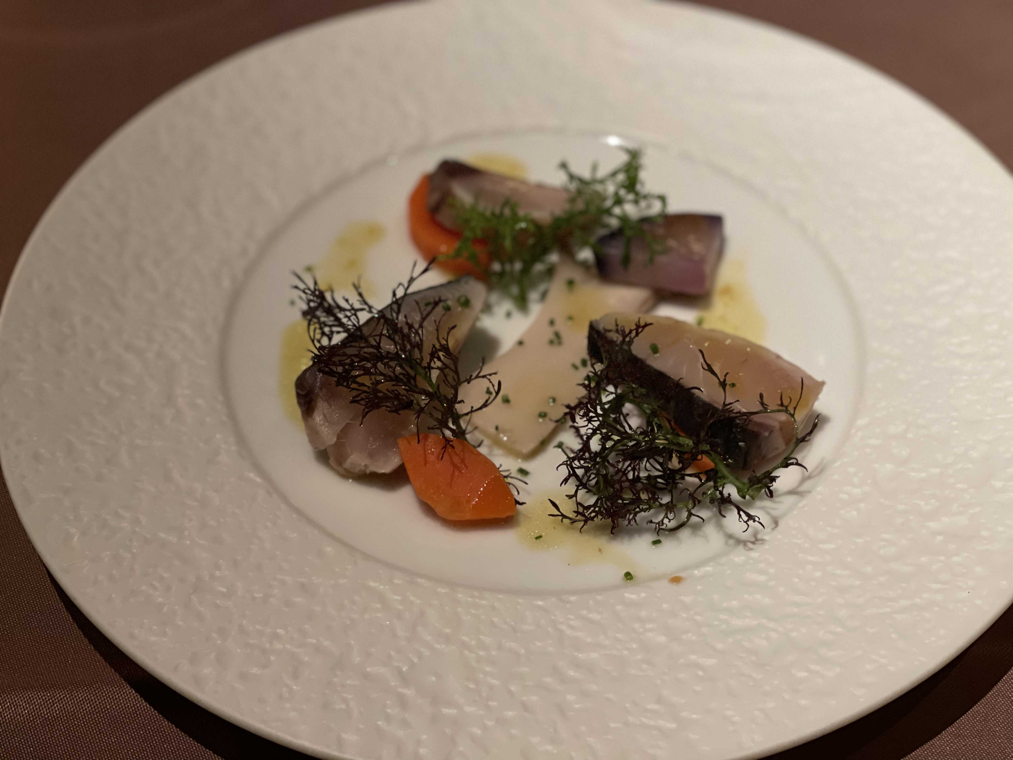 이제 순서대로 음식이 나오는데 제일 왼쪽은 차가운 생선회요리. 제일 오른쪽은 흰살 생선과 스프요리였는데 별로 입에 안맞아서 잘 안먹었다.