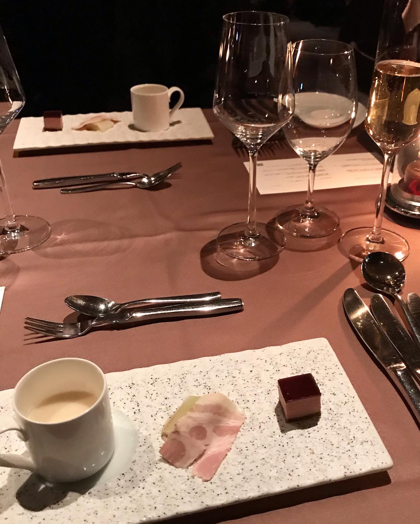 그리고 처음으로 아뮈즈부슈가 나온다. 프렌치에서 처음에 한입 크기에 간편하게 먹을 수 있는 요리를 내는 것을 말한다는데 직원분이 메뉴를 설명하실 때 잘 못들어가지고 왼쪽이 무슨 스프인 지 모르겠다. 딱 먹고 쓴 맛이 나서 한입만 먹었다.