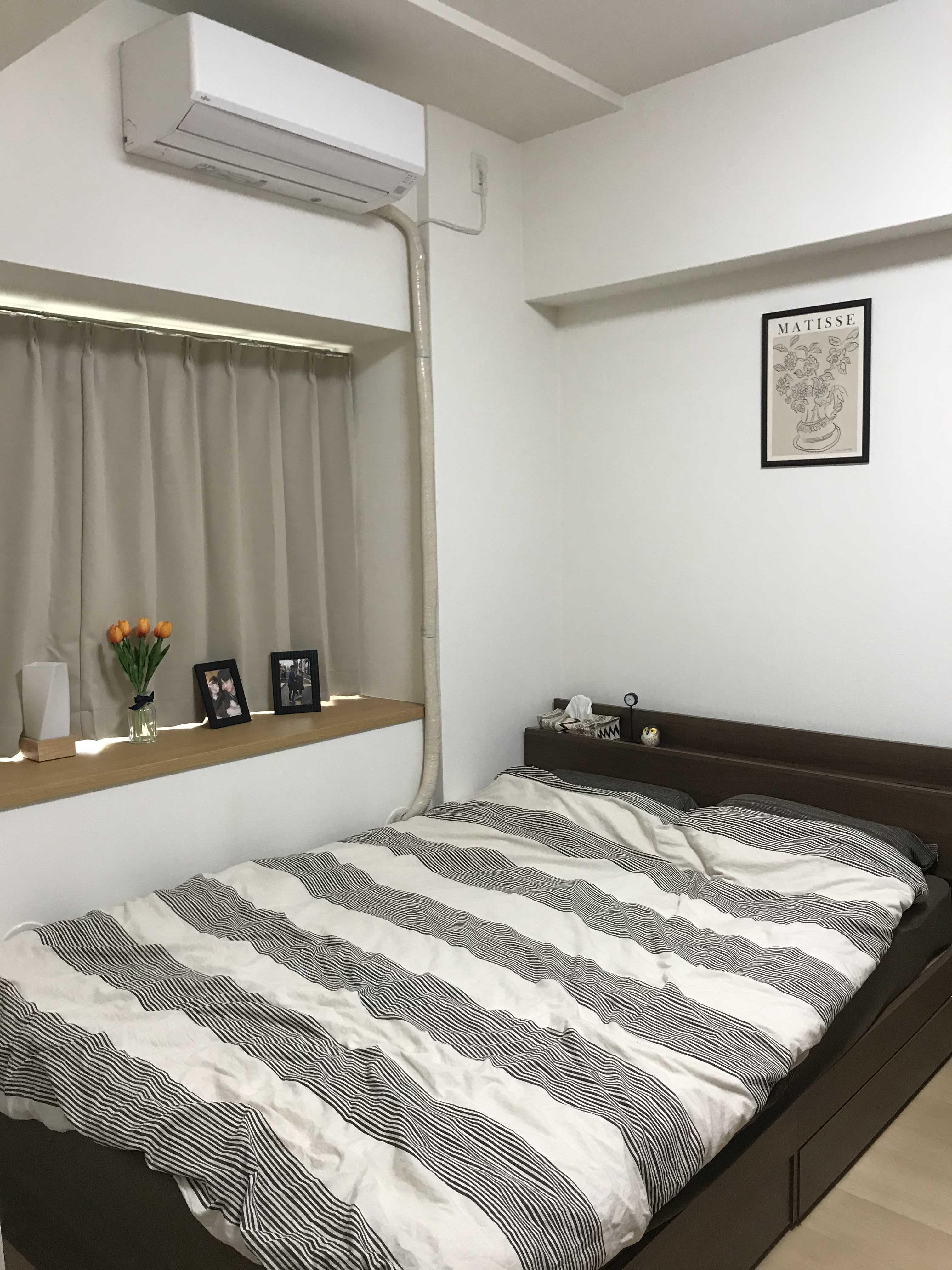 침대 위에 있는 액자도 한국에서 구매했고 원래 작은 창을 막는 커튼이 어두운 컬러라 방이 침침했는데 침대 커버를 바꾸면서 색을 다 베이지 톤으로 맞추었다.