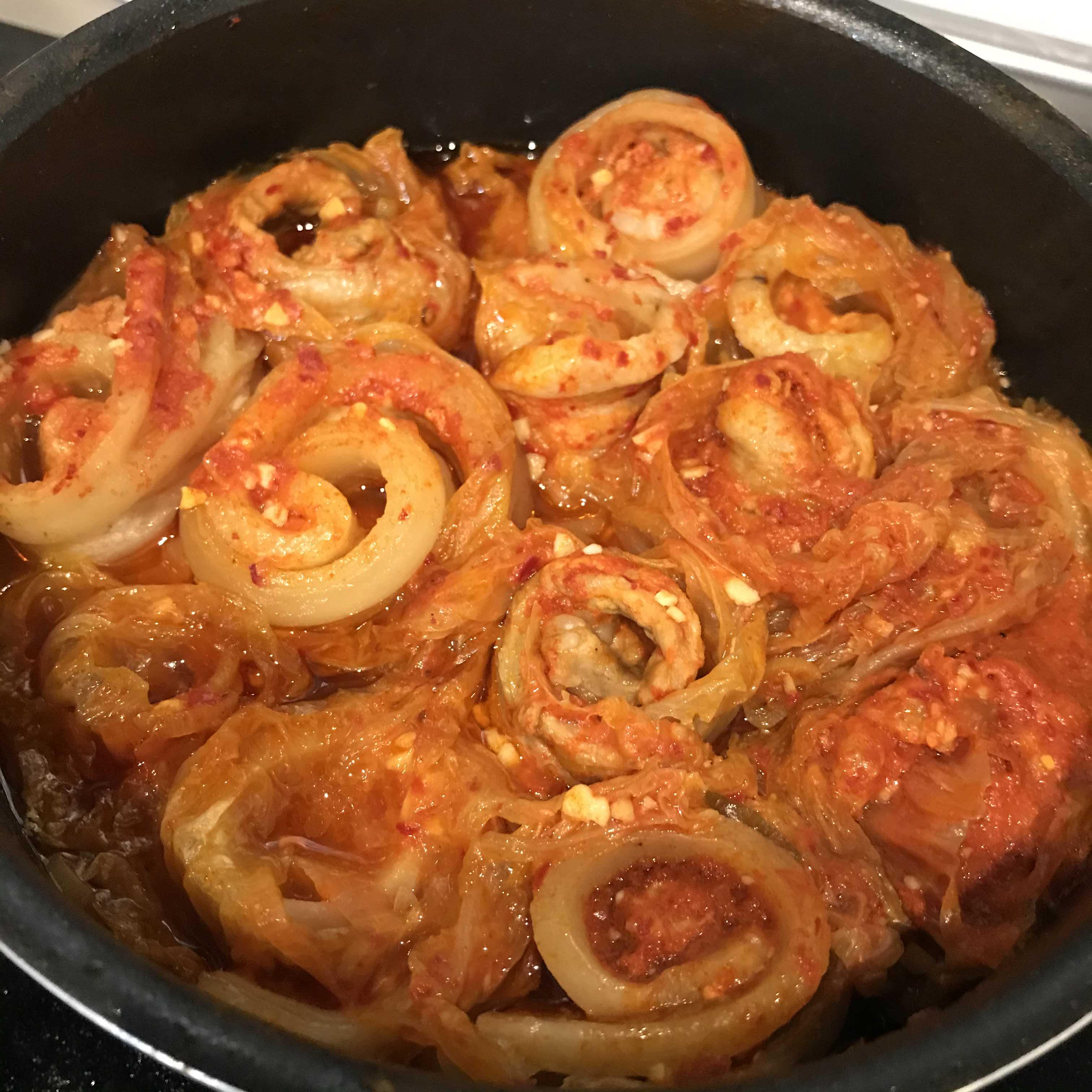 2. 육수에 대파 반개 정도를 넣고 설탕 한스푼, 김치국물과 위에서 만들어 둔 김치말이 (삼겹살, 김치) 를 차곡차곡 넣고 끓인다.