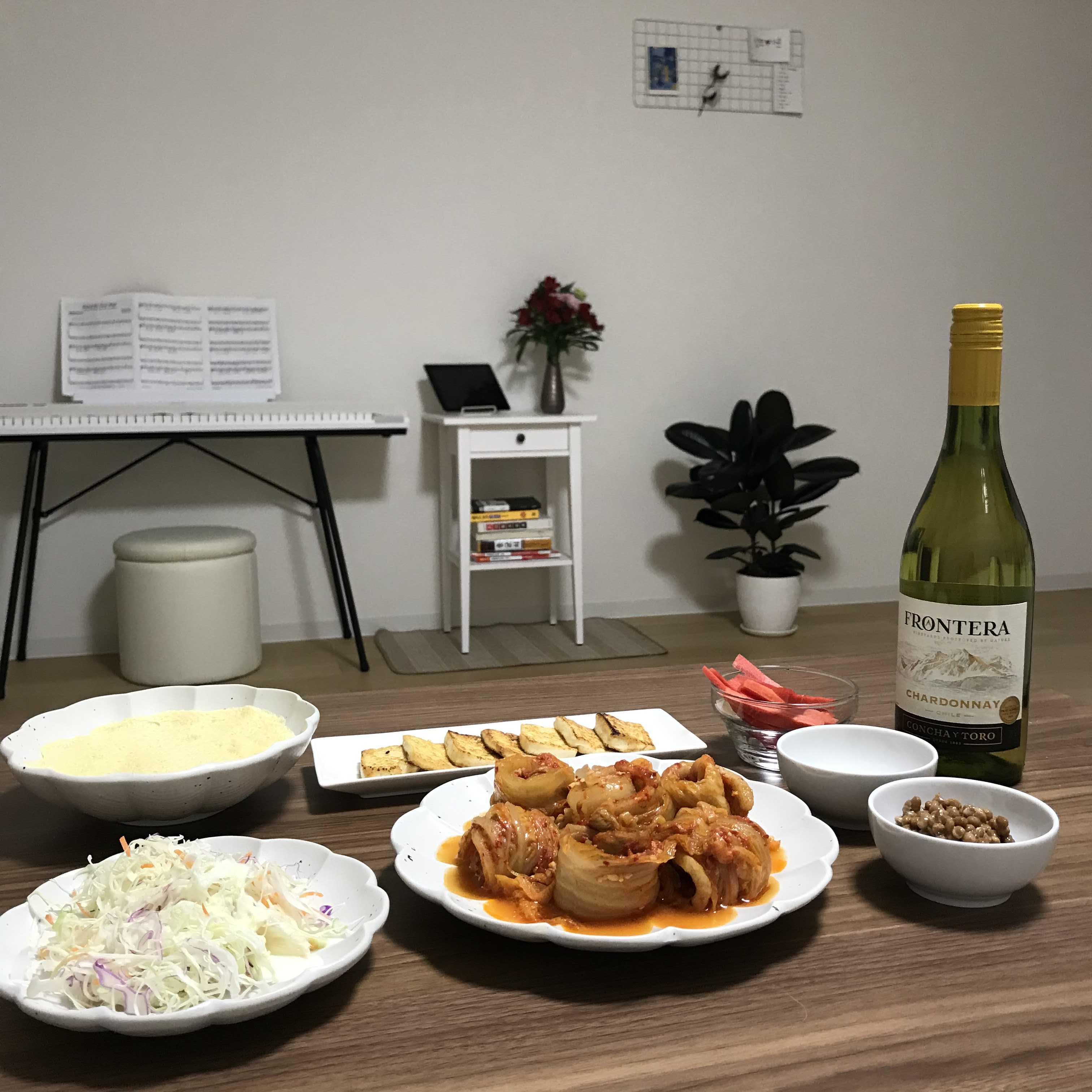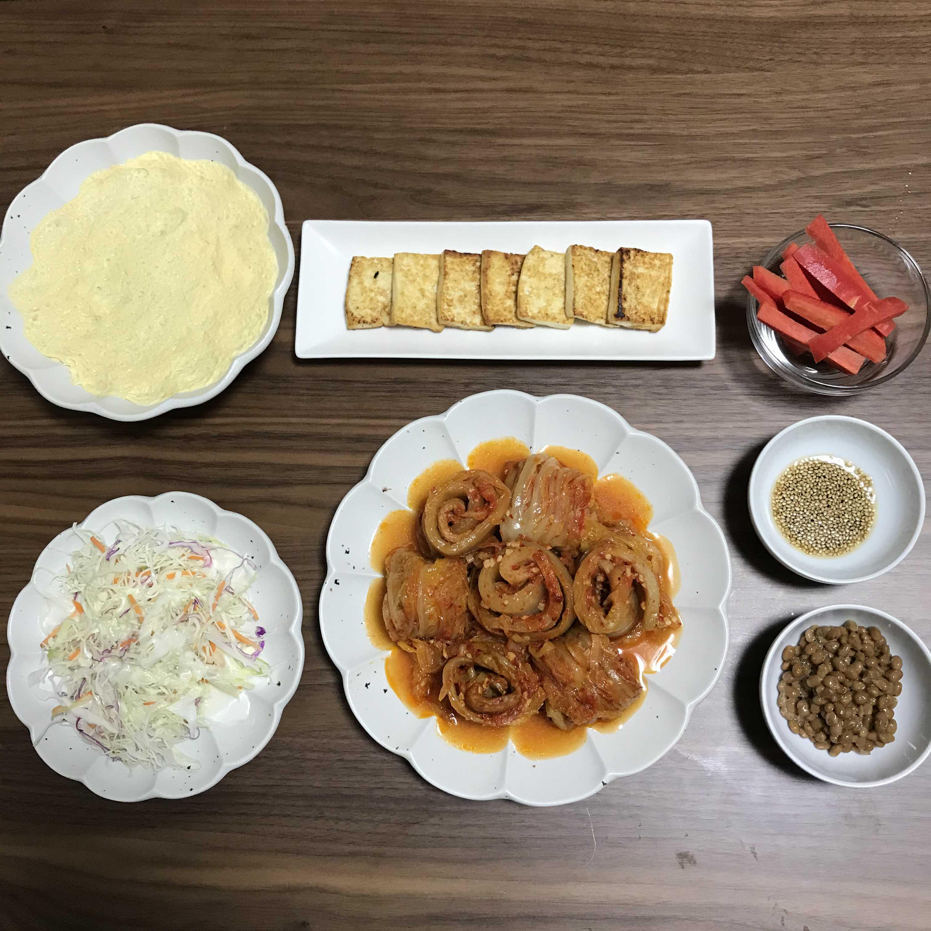 김치찜 가게에 가면 늘 계란말이를 같이 파니까 곁들인 계란찜과 야채 먹으려고 샐러드도 내놓고 두부도 구웠다. 낫또는 내가 좋아해서 먹으려고 간장 없이 낫또만.