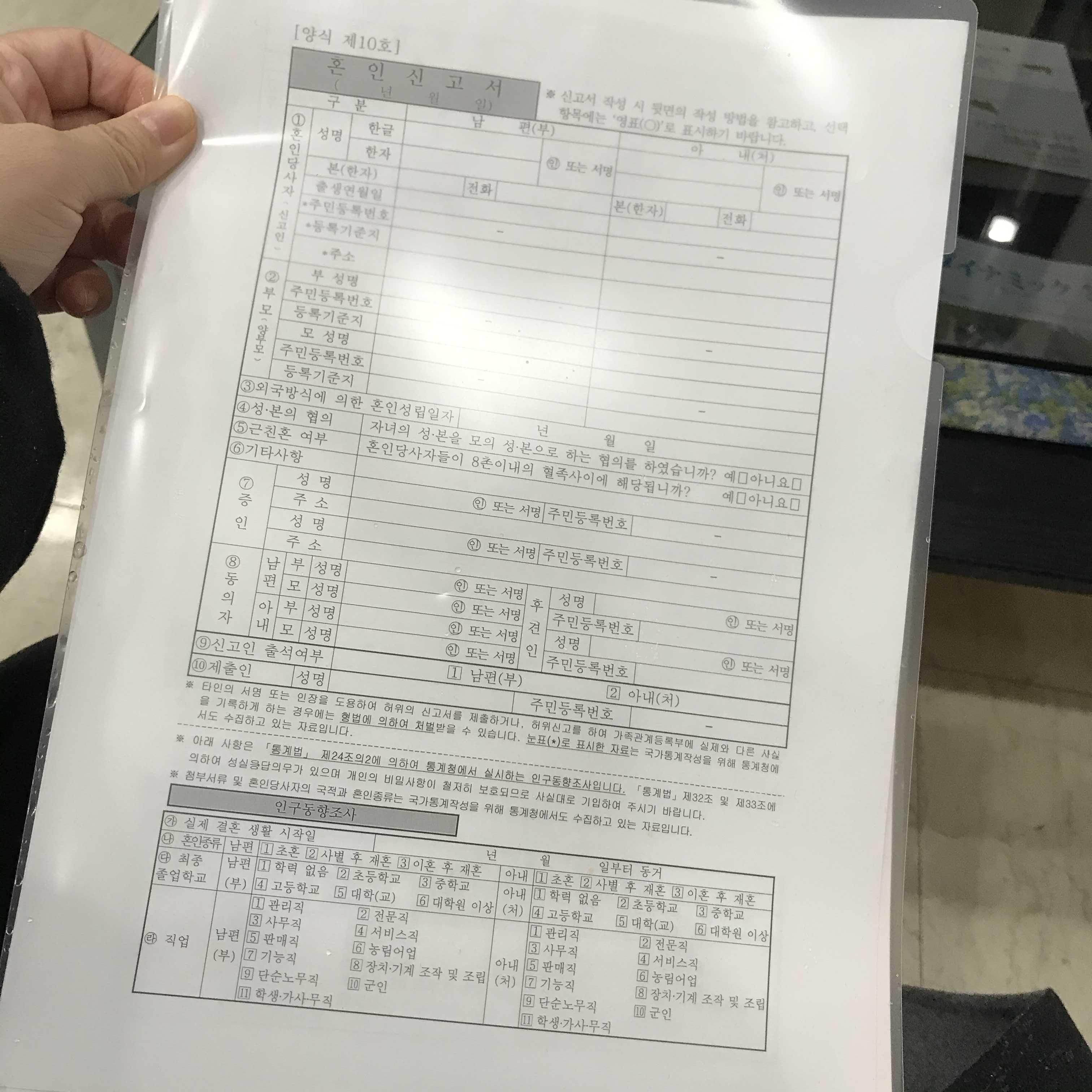 그런데 막상 혼자 혼인신고를 하러 갔을 때 불가하다는 이야기를 들었다. 그 날 결혼을 하고 싶은 날짜로 정해놓고 서류를 제출하러 간 것이기 때문에 상당히 난감했다. 그러나 처리를 해주셔서 결국 혼인 신고를 할 수 있었다.