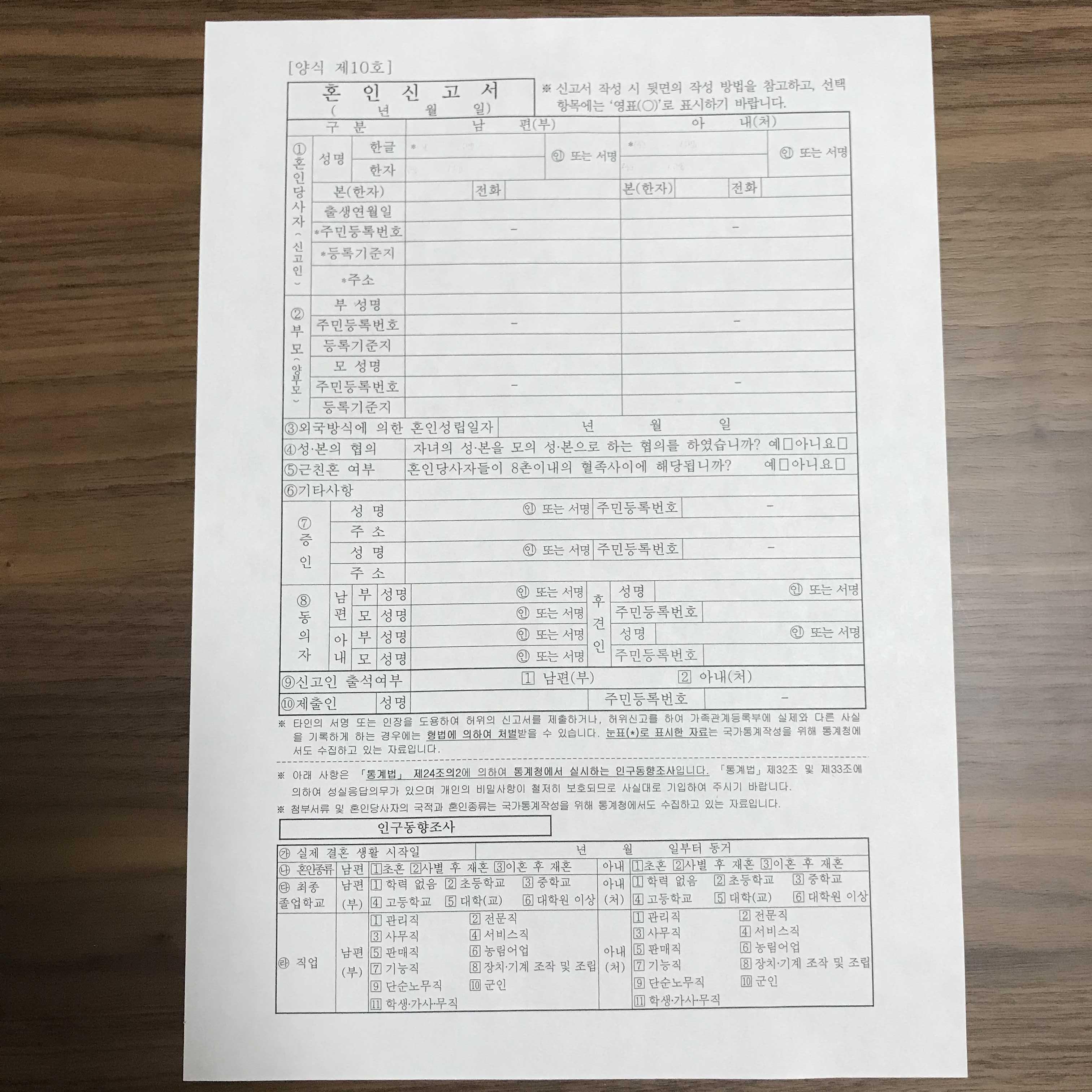 서류를 발급받았다면 혼인신고서를 작성해서 같이 영사관에 제출하면 혼인 신고 완료인데, 혼인신고서를 작성할 때 조금 난감한 부분이 증인 2명의 서명을 받아야 한다는 것이다. 한국이면 가족이나 친구에게 부탁하면 되지만 일본에서 한국인의 서명을 받아야 하기 때문에 조금 시간이 걸렸다. 일본인의 서명이 되는지는 모르겠는데 주민등록번호를 써야 하고 한국 서류이기 때문에 나는 한국인 2명의 서명을 받았다.