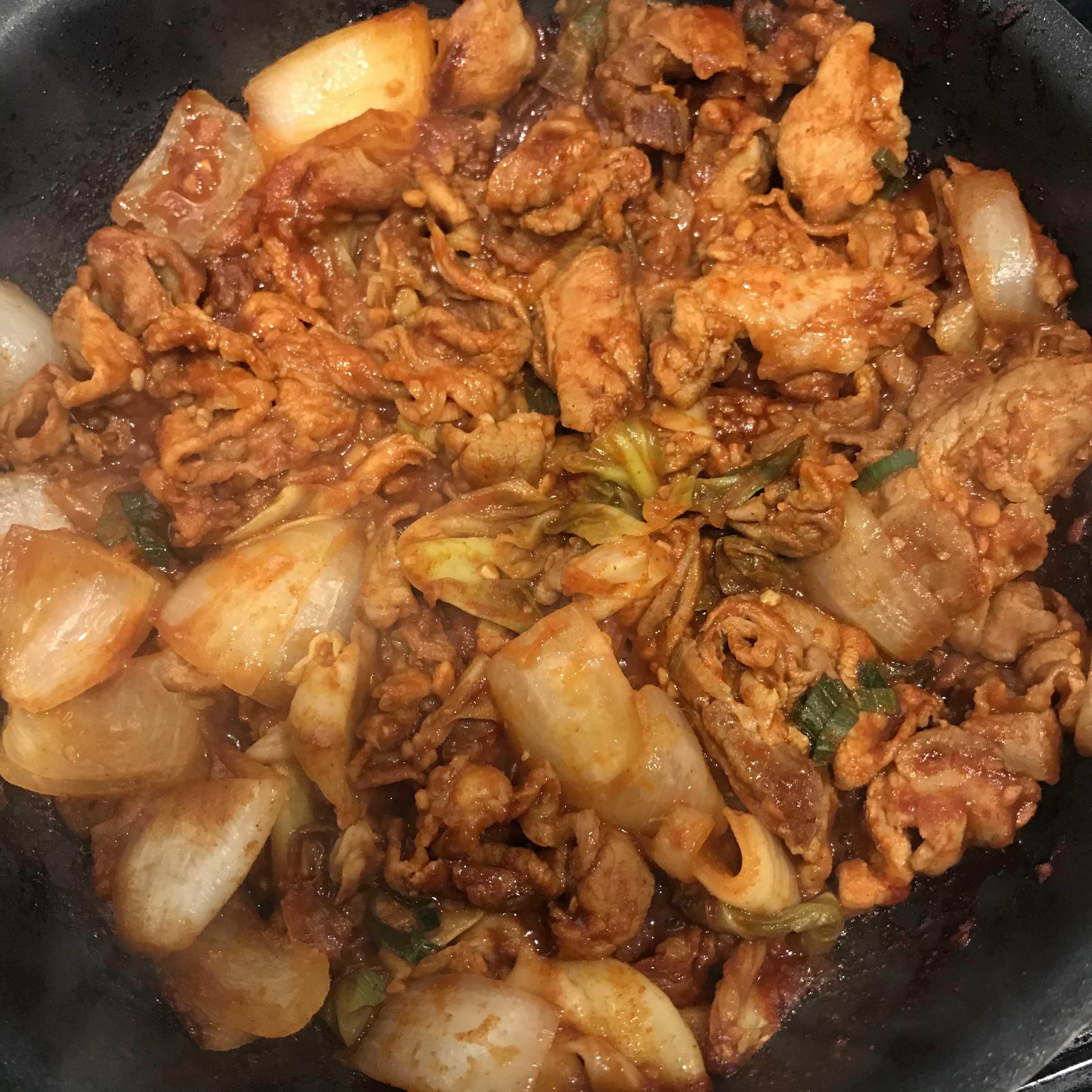 양파와 양배추도 많이 넣어서 야채 섭취까지 골고루 할 수 있는 제육볶음. 국물 없이 볶으면 타기 쉬우니 조리할 때 조심해야 한다.