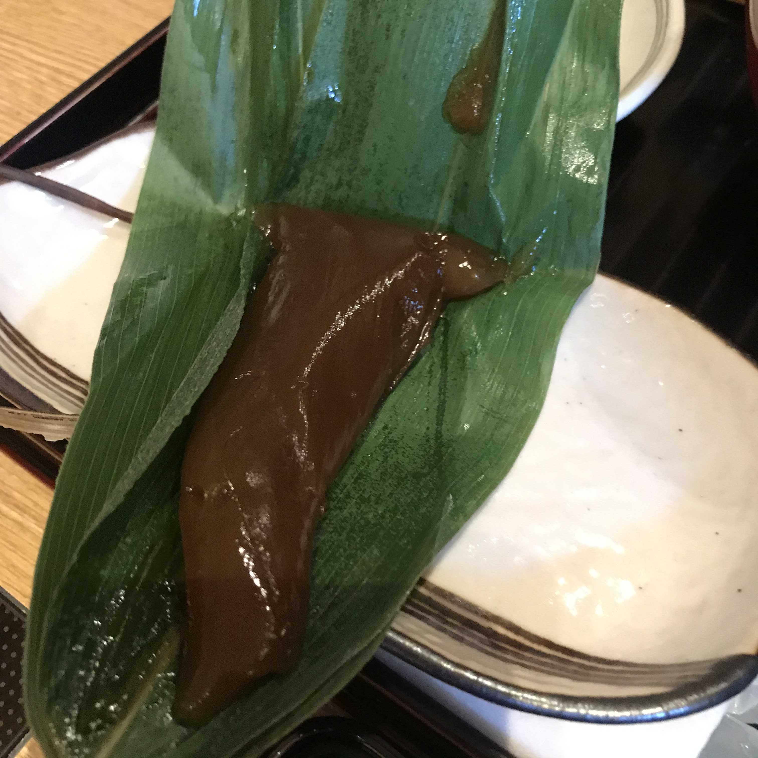 깔끔한 일본의 정식으로 된장국과 절인 야채를 같이 먹다가 후식으로 달달한 젤리 같이 보이는 잎에 싸인 디저트가 있었는데 연근과자 れんこん菓子 라고 써 있었는데 정확히 뭔지는 모르겠다.