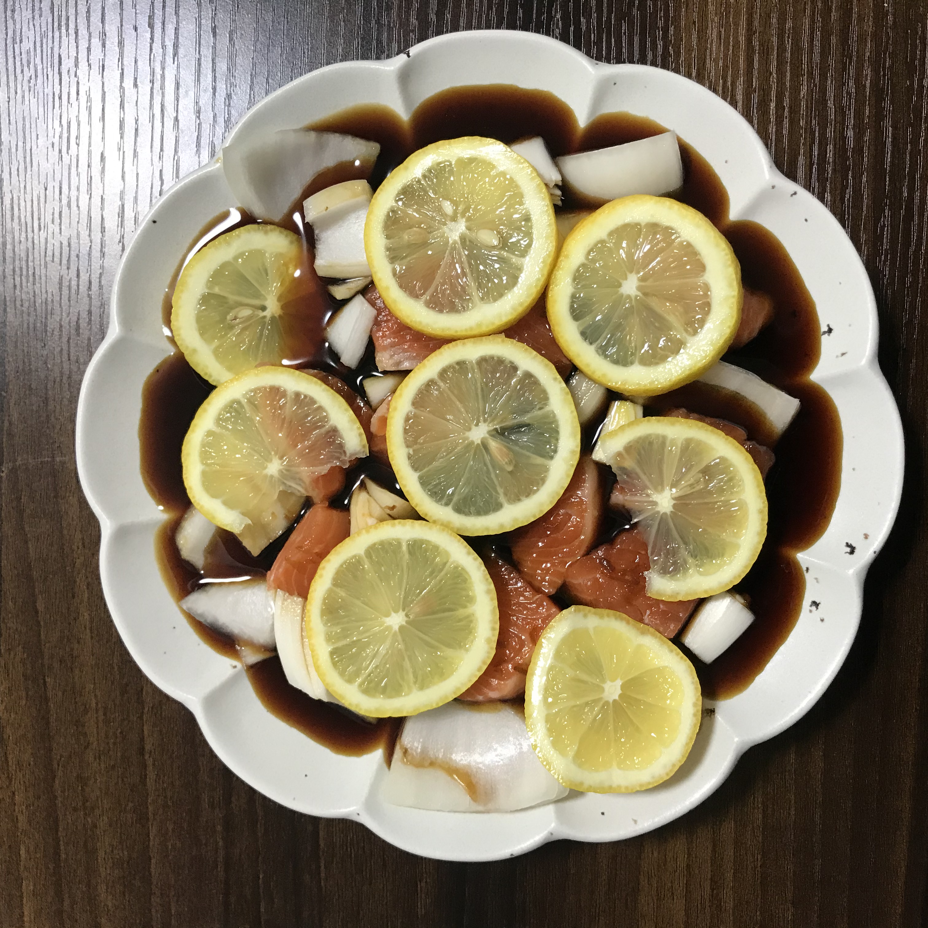 4. 연어와 양파를 한입 크기로 잘라 양념장에 담그고 위에 레몬 한개를 슬라이스 해 올려 하루동안 냉장고에 넣어둔다.