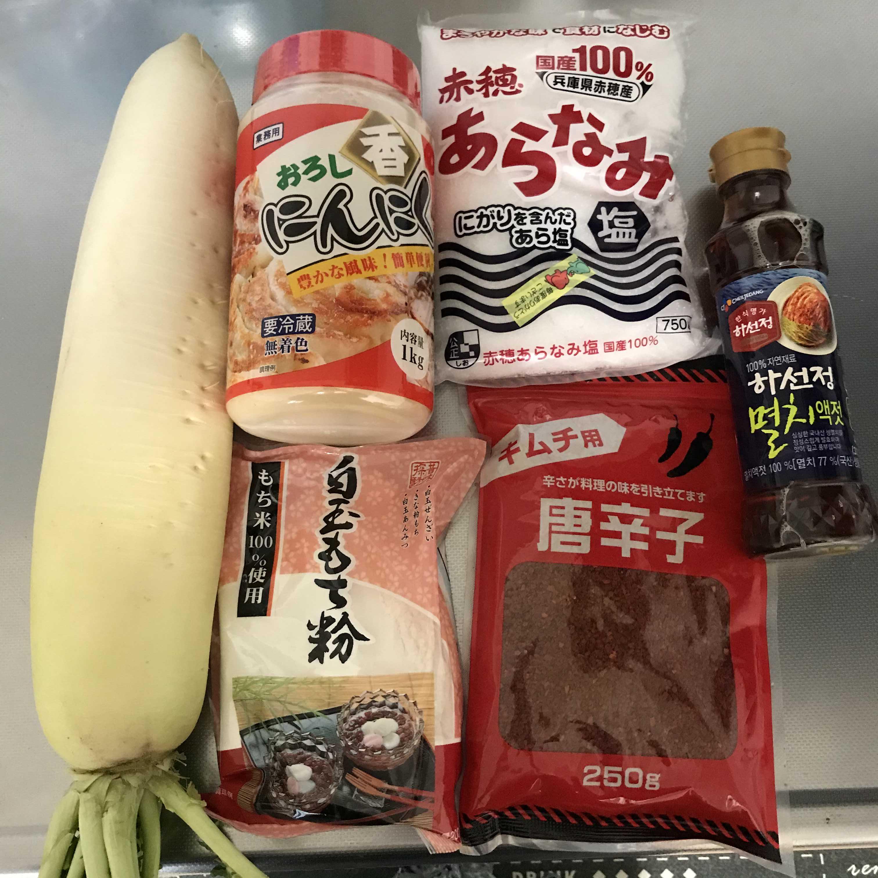 정말 일본스러운 깍두기 재료 준비. 무도 일본~ 간 마늘, 꽃소금대신 아라시오, 굵은 고추가루, 찹쌀가루까지 다 일본 재료들이다. 멸치액젓만 하선정.ㅋㅋ