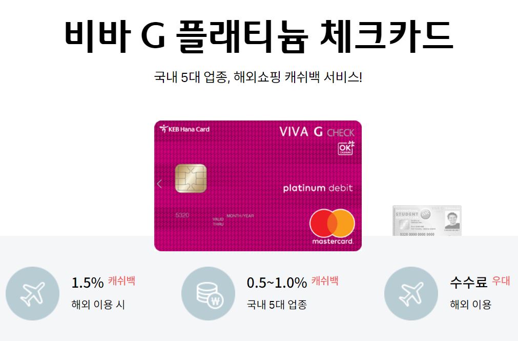 그런데 이번에는 한국 돈을 일본에서 출금하려고 하는 거라서 다른 방법이 뭐가 있나 찾아보니까 생각해보니 비바 G 플래티늄 체크카드가 있었다. 일본 워킹홀리데이를 가는 사람이라면 누구나 하나 쯤 만든다는 하나은행의 비바 체크카드.
