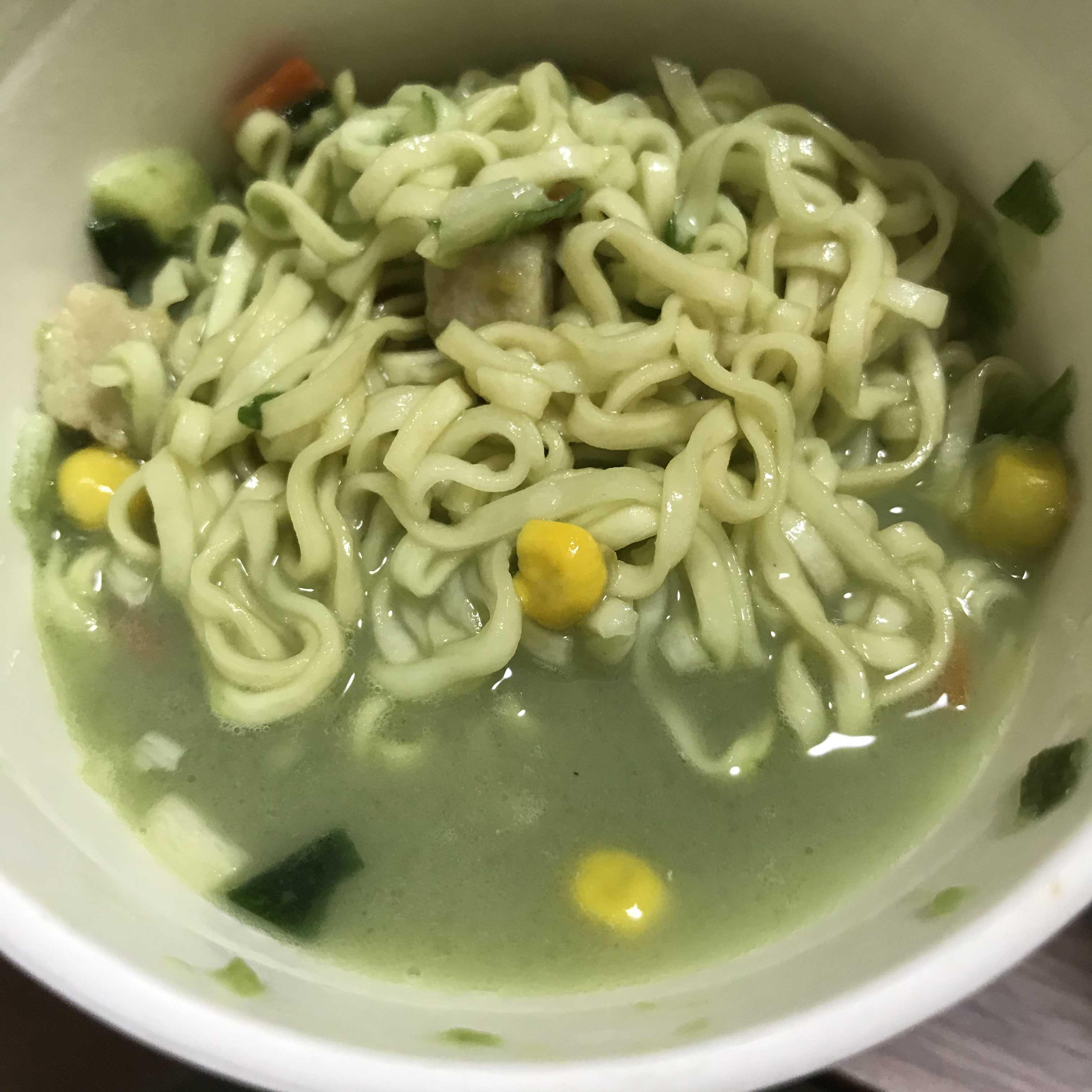 국물은 닭스프 같은 맛에 녹차맛이 더해진건데 굉장히 텁텁하다. 컵라면이라면 응당 국물을 호로록 마셔서 크아~하고 나오는 시원한 인스턴트의 맛이 있어야 하는데 딱 한입 먹자마자 먹기 싫어지는 국물맛이다.