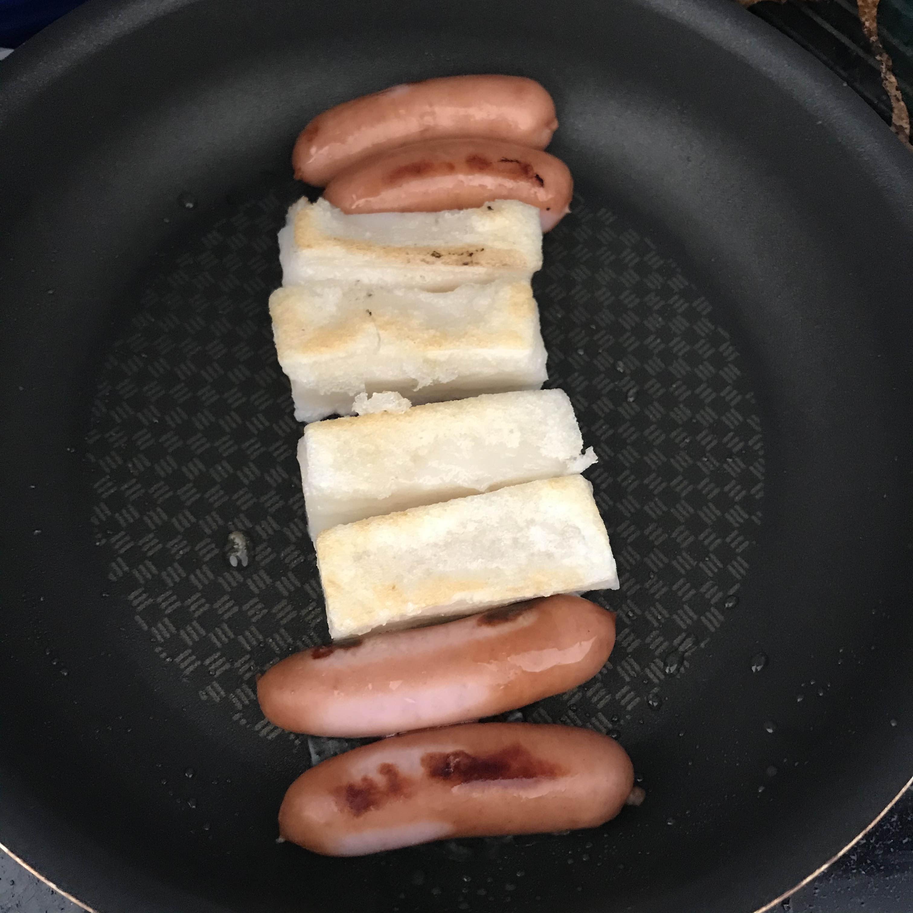 반면 일본 떡은 튀겨도 전혀 상관이 없다. 그래서 떡이 늘어지지 않게 일단 사각형 떡을 4등분 해서 기름에 튀기듯 구워줬다. 소시지도 함께 구우면서 모양을 잡아주었다. 서로 붙지 않게 해줘야 한다.