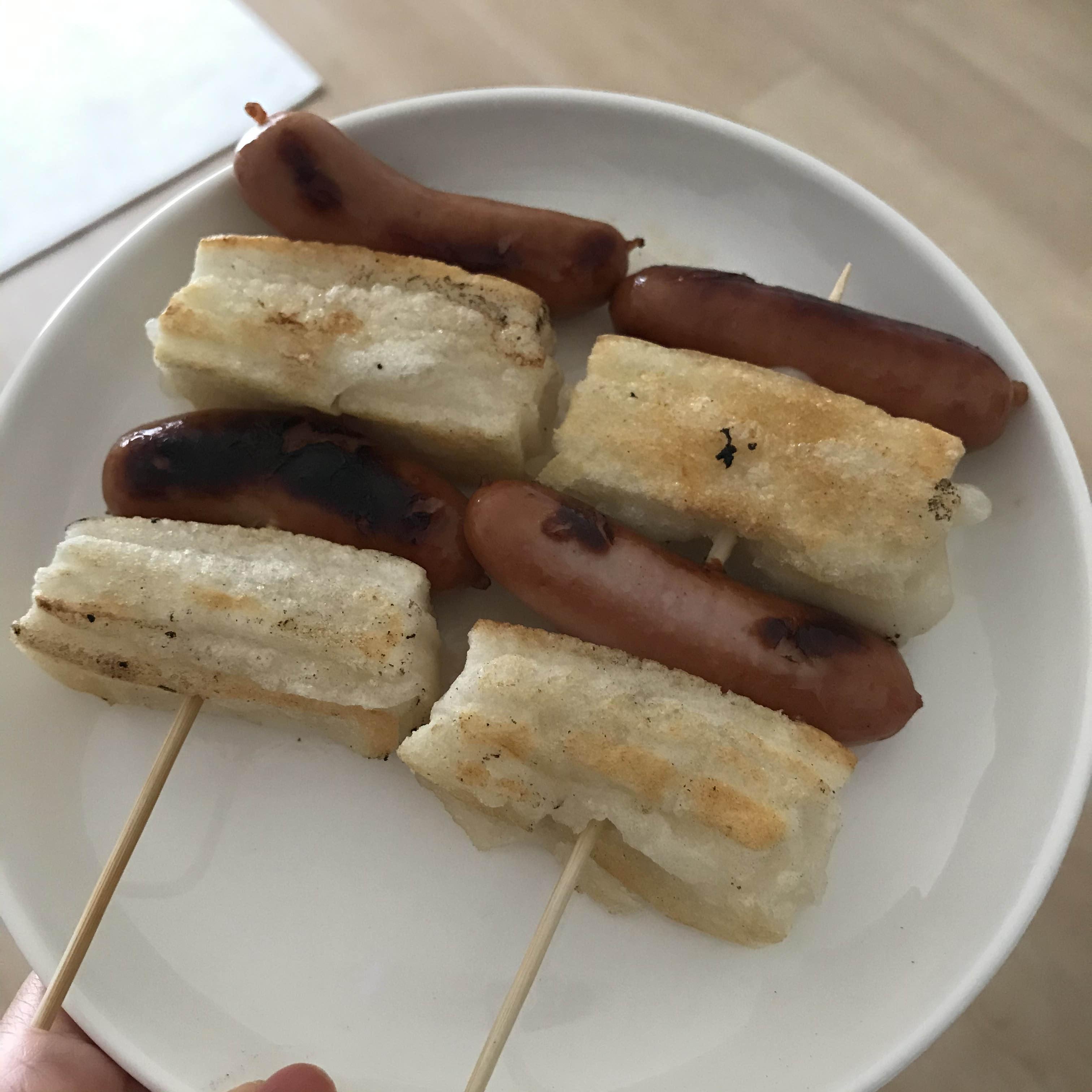 꼬치전을 해먹을 용도로 산 길다란 꼬치가 집에 있어서 거기다가 떡과 소시지를 순서대로 꽂아주었다. 일본 떡을 구우면 약간 누룽지처럼 고소한 맛이 나면서 그 구워진 부분이 정말 맛있다.