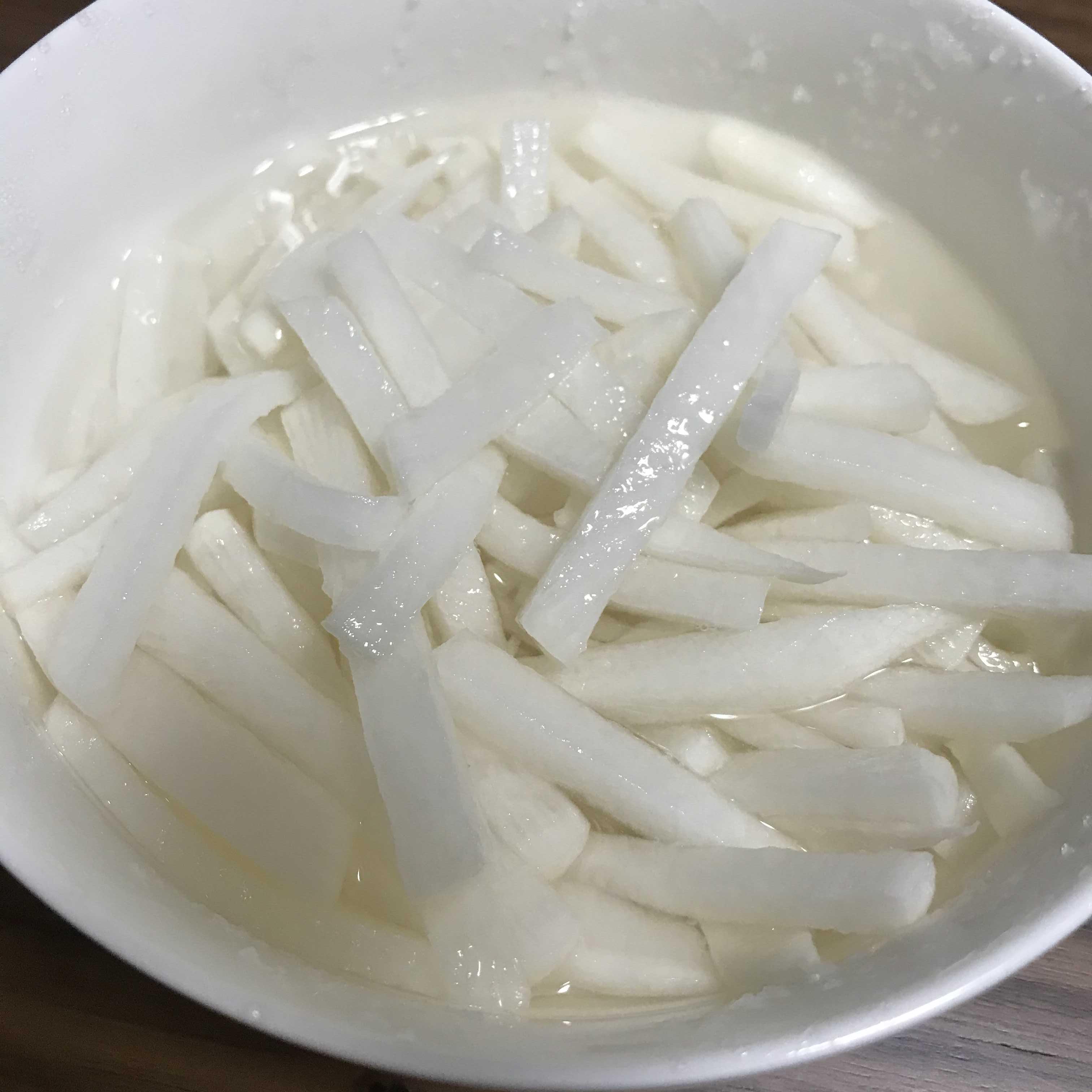 여기에 소금한술, 설탕8술을 넣고 10분마다 뒤적이면서 30분 절인다. 무가 조금 작는 사이즈라 그런지 소금이랑 설탕을 좀 덜 넣어도 될 것 같다.