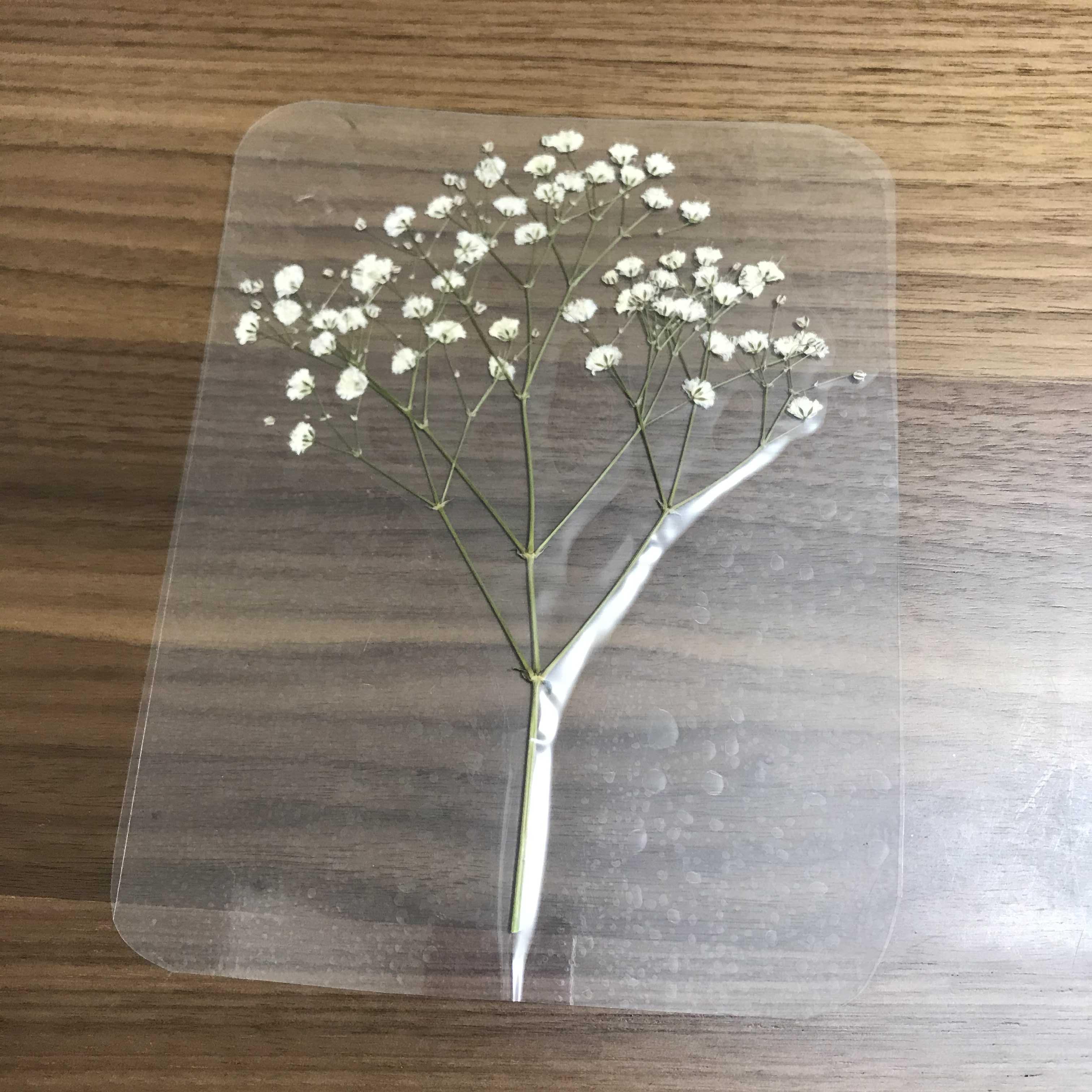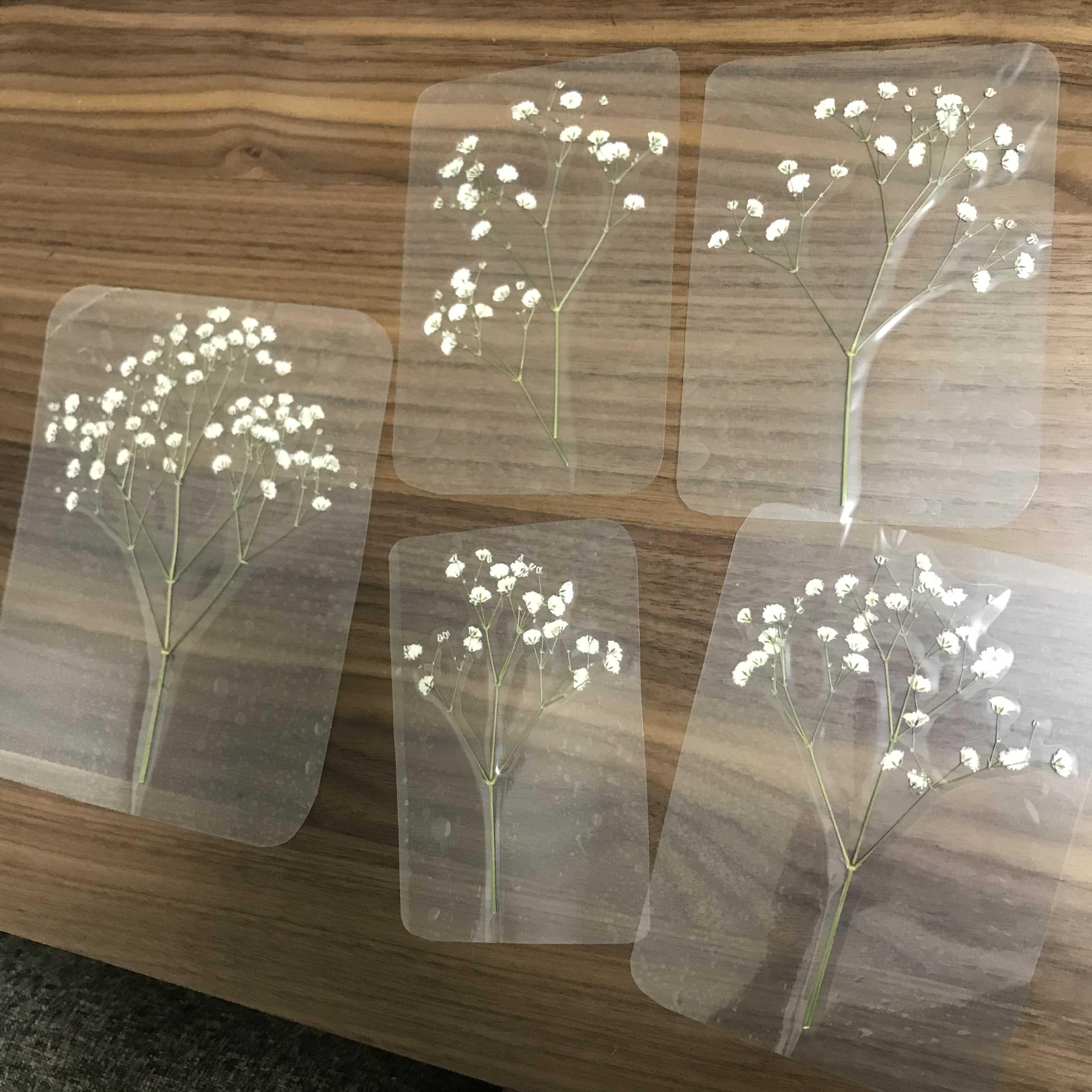손코팅지는 붙어 있는 코팅지를 떼서 안에 압화를 넣고 다시 붙이기만 하면 되는 간단한 작업이다. 안에 기포가 생기지 않도록 만들어 줘야 하지만 압화는 두께가 있다보니 어느정도는 볼록하게 만들어진다.