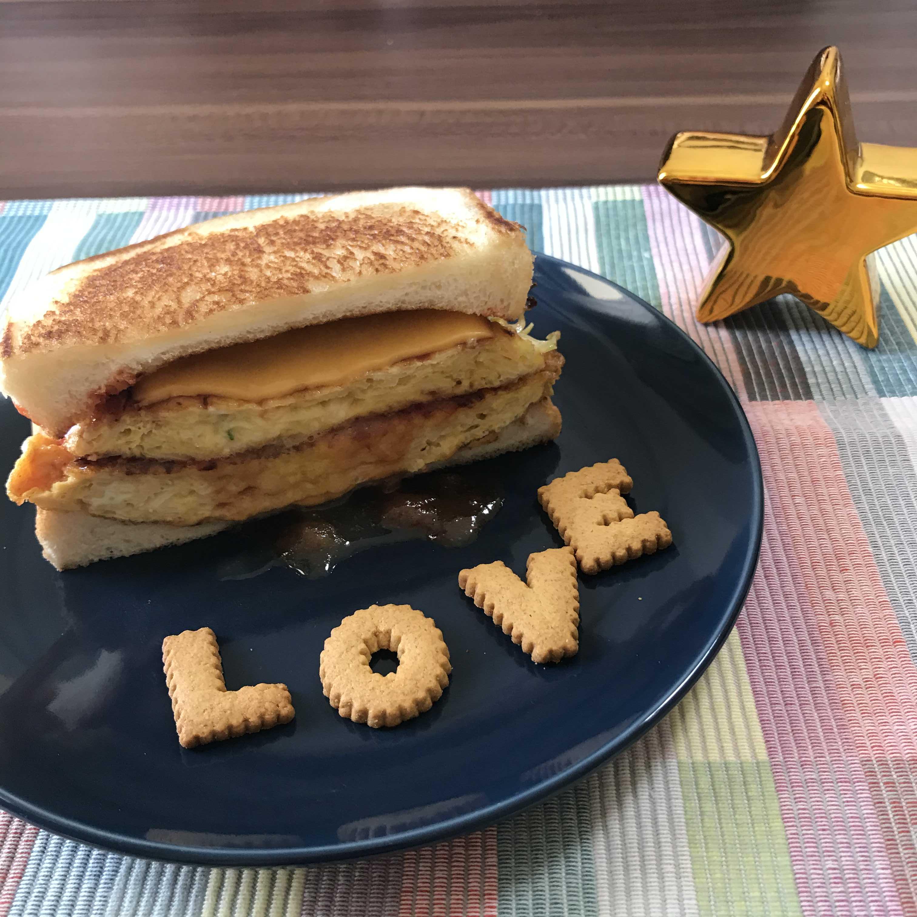 계란물에 야채도 썰어 넣고 두툼하게 부쳐서 치즈랑 딸기잼을 넣고 만들었다.