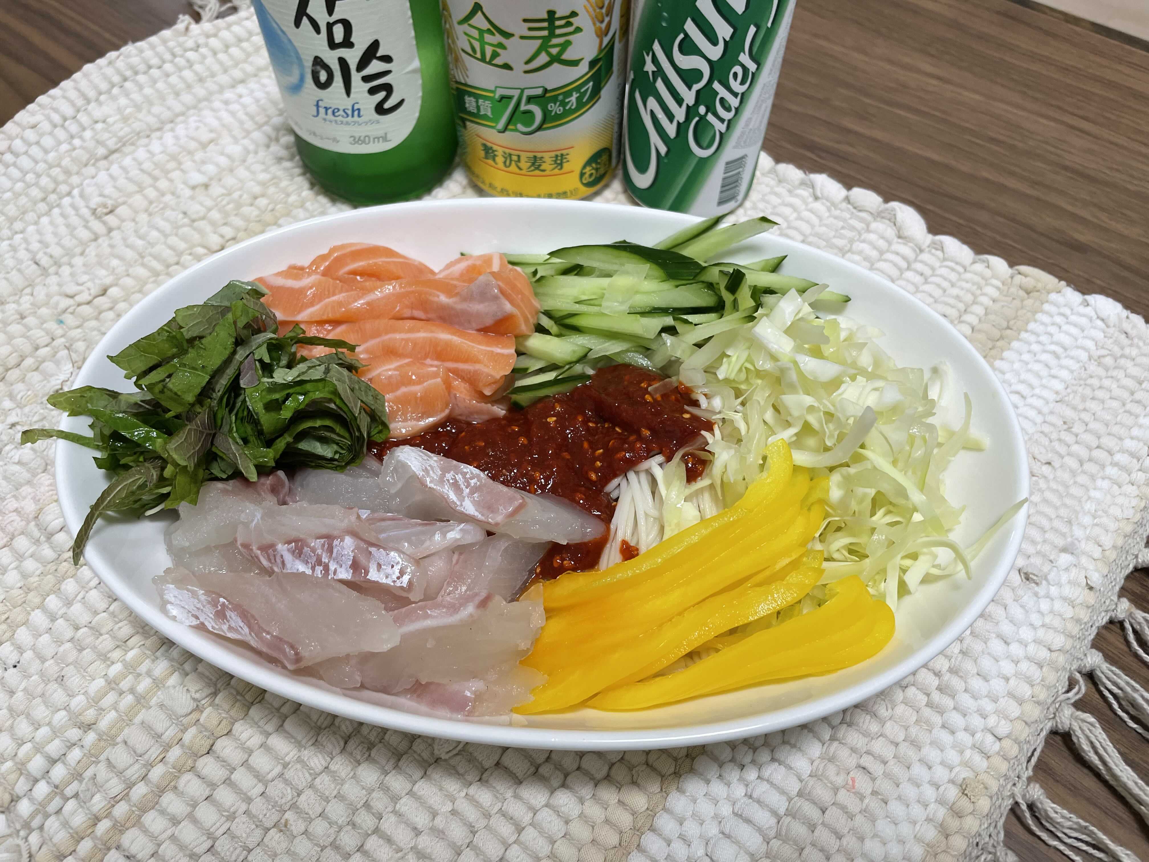 나는 양배추 한주먹, 깻잎 한주먹, 오이 반개, 파프리카 4분의 1개, 회와 소면 1인분을 준비했다.