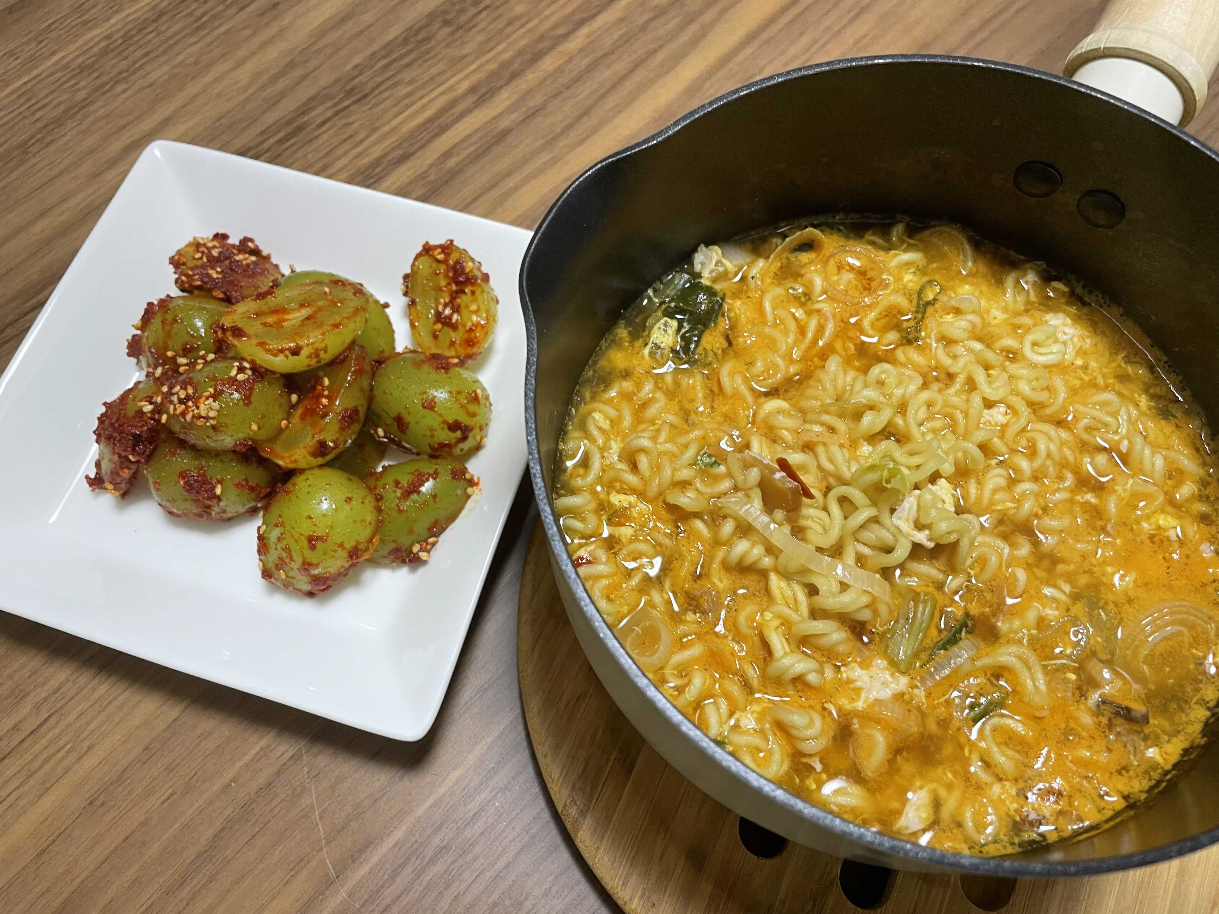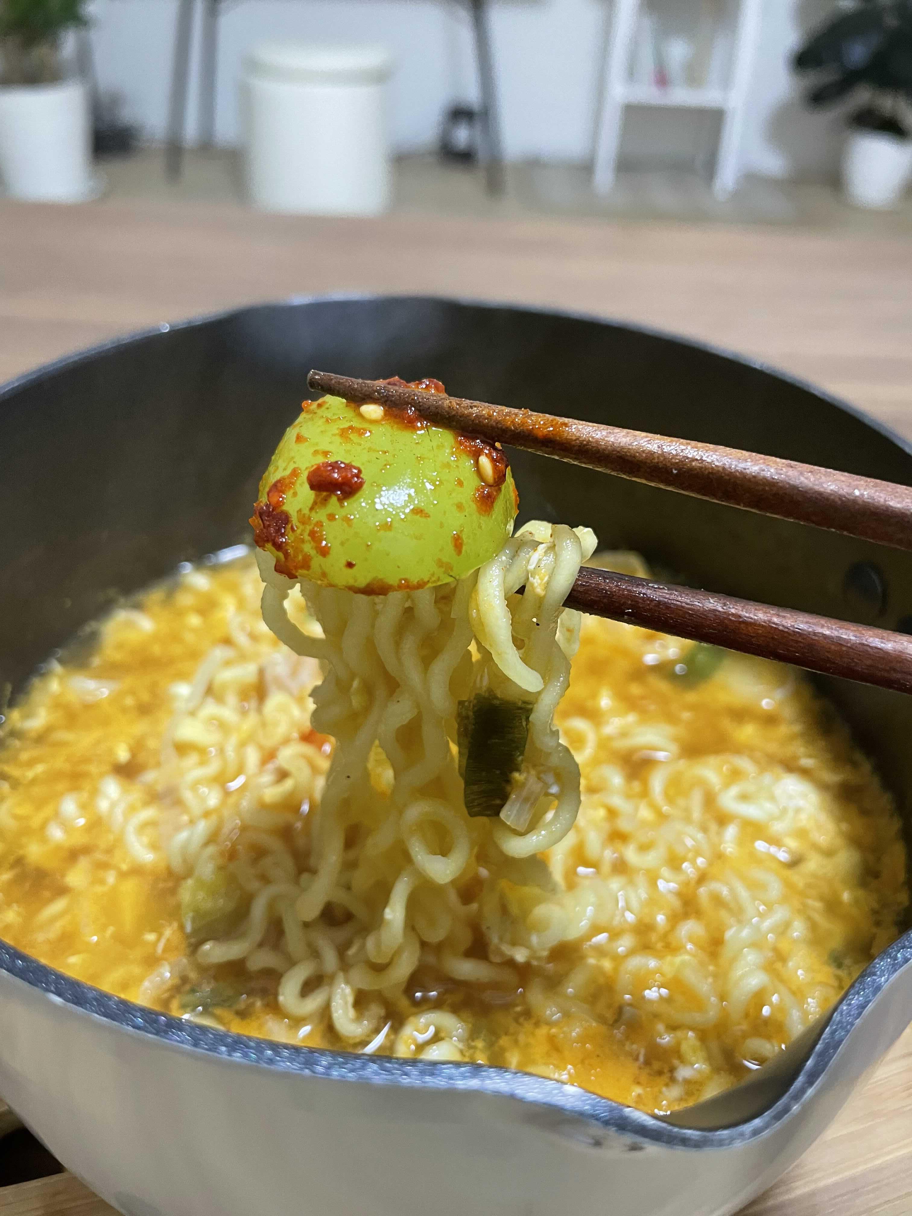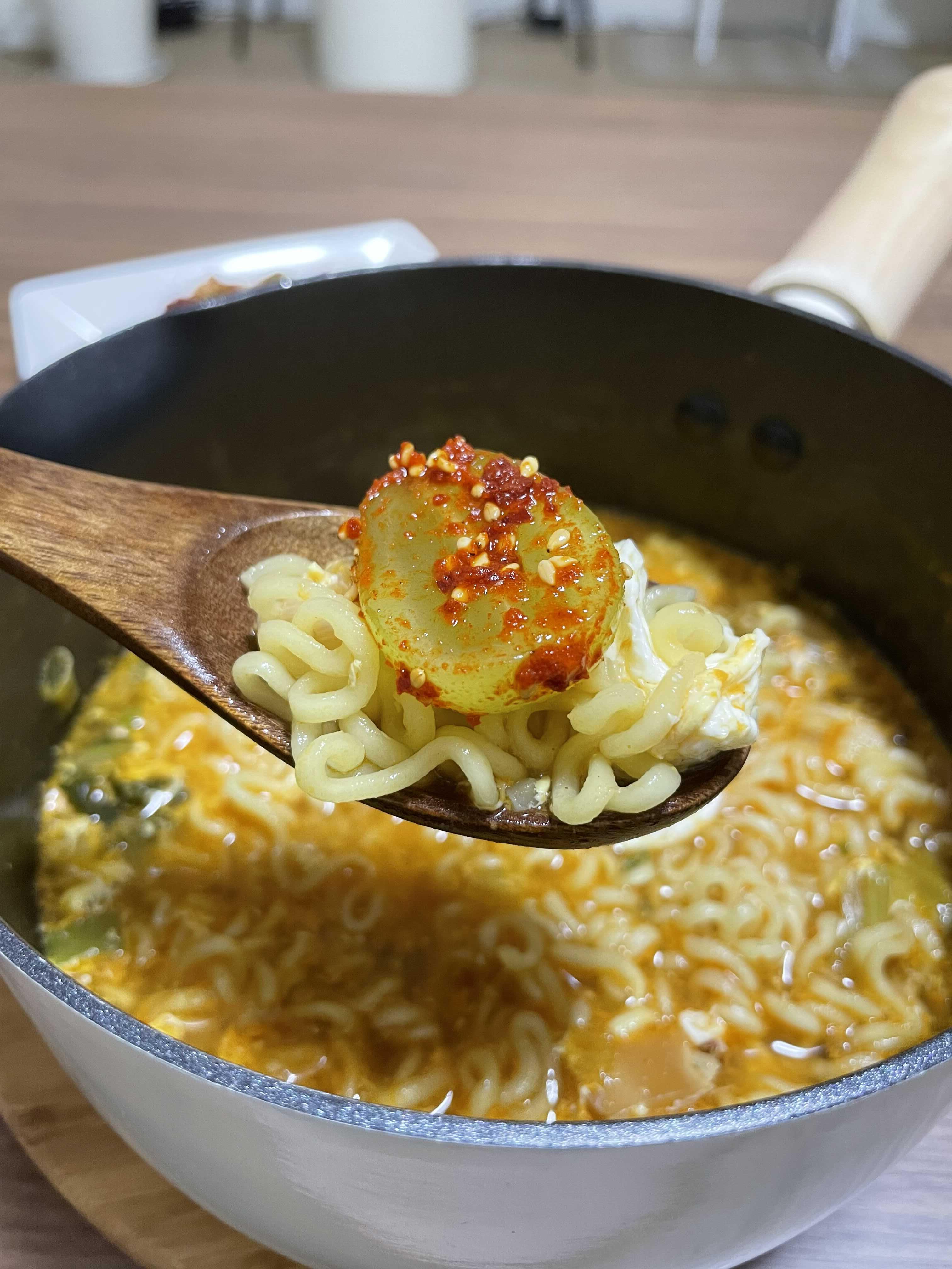 평범한 신라면이 샤인머스켓 김치와 함께 하니 고오급 라면이 되는 것 같은 기분이었다.
