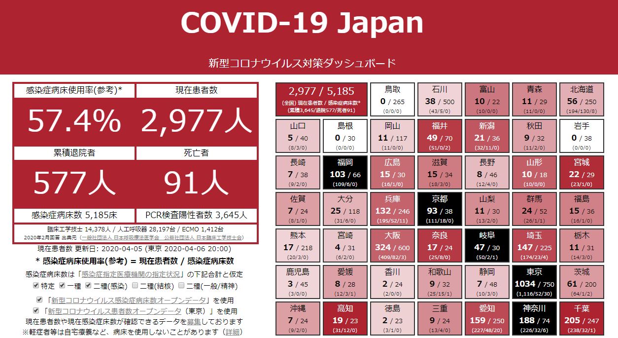 거래처 들은 이미 한달 전부터 자택 근무를 하는 곳이 굉장히 많아졌고, 주문을 하면 결품이 나는 경우가 다반사가 되었다. 오늘은 회사 사람이 일본 국내에서 코로나 환자 현황을 지역별로 확인할 수 있는 사이트를 알려줘서 확인했다.