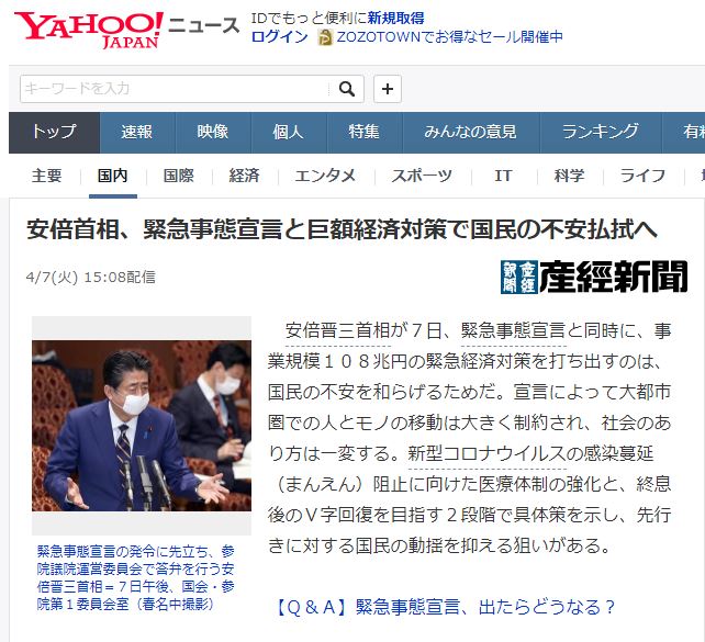 일본 긴급 사태 선언이 발효하는 기간은 8일부터 약 한달간이라고 한다.