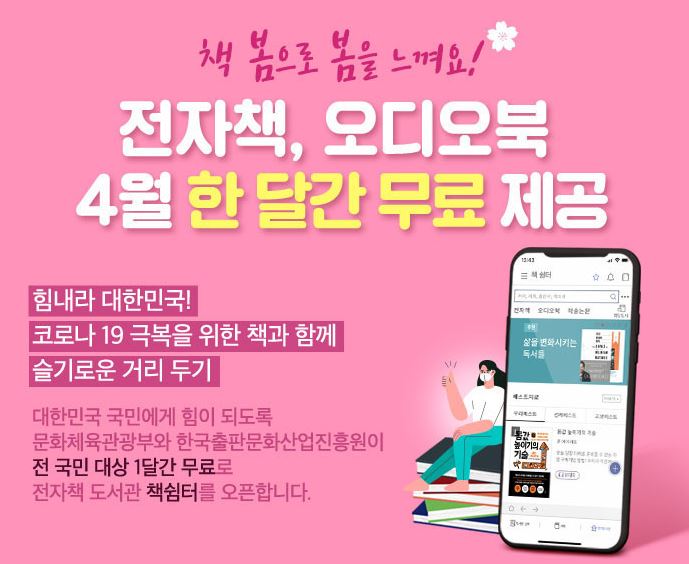 집콕이 이어지는 나날 속에 문화체육관광부와 한국출판문화산업진흥원에서 4월 한달 동안 e-book을 무료로 대여해주고 있다는 소식을 들었다. 교보문고 아이디가 있으면 한달 동안 2권의 책을 무료로 볼 수 있다.