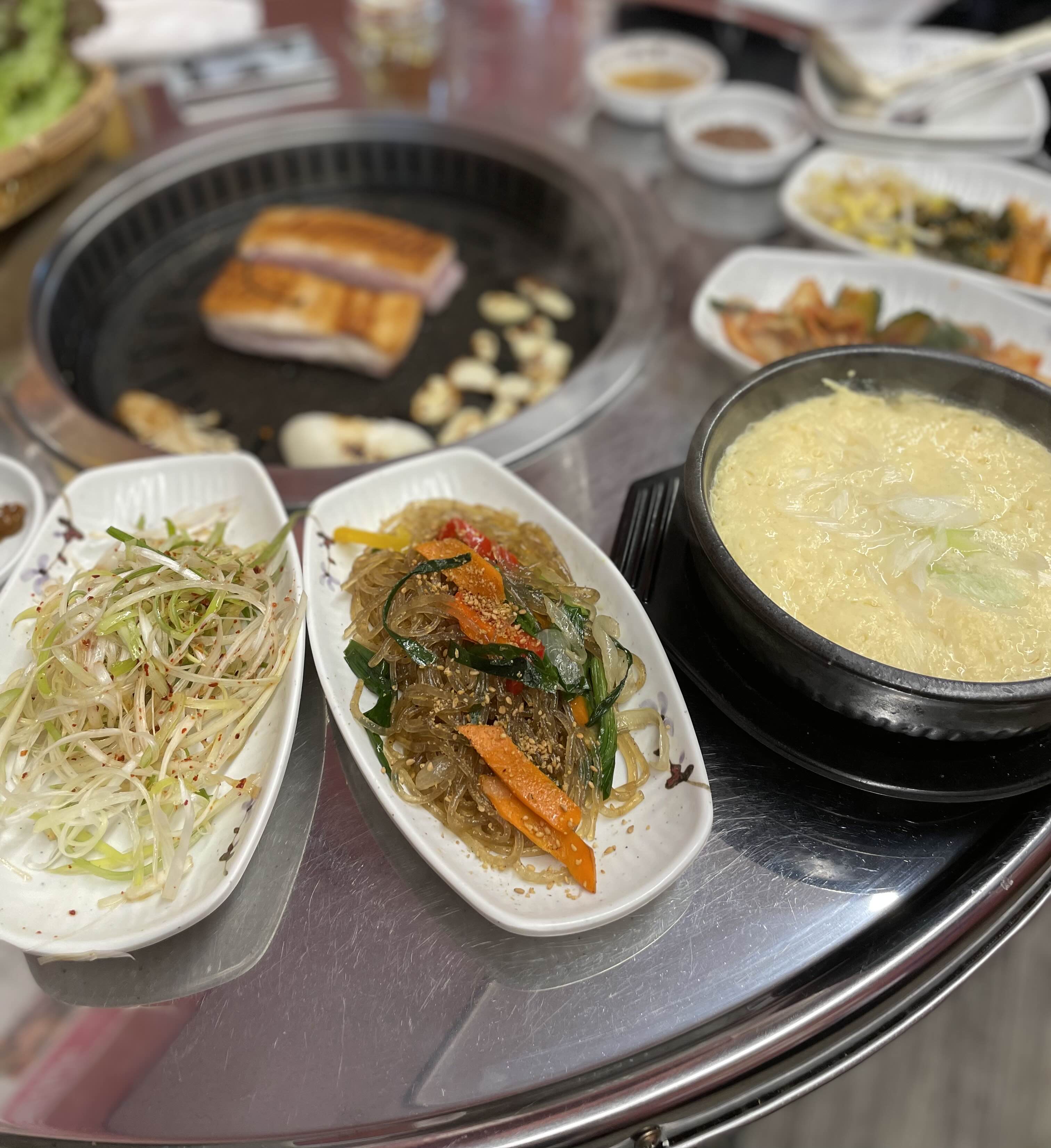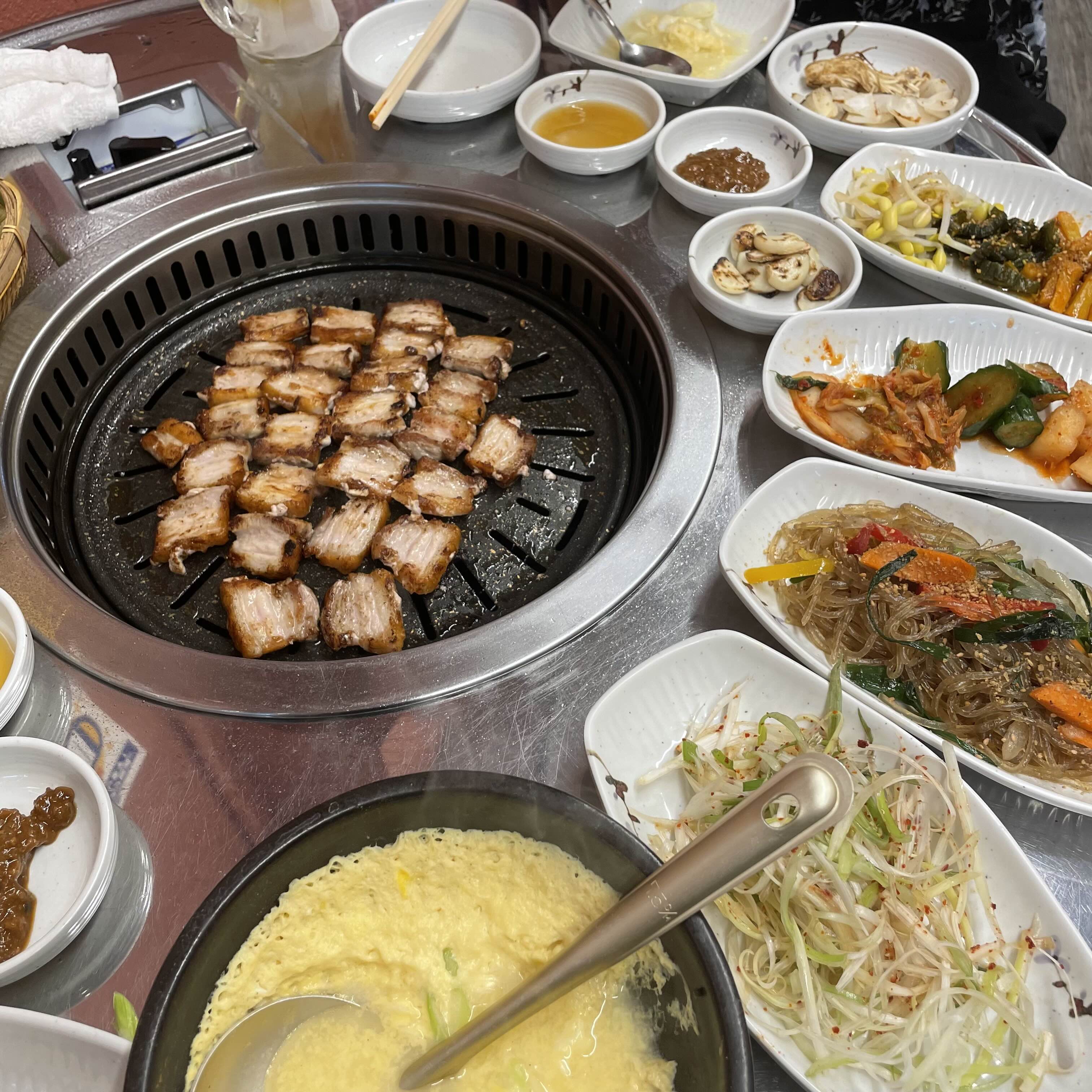 런치 메뉴 삼겹살을 시키면 계란찜부터 쌈채소, 쌈장, 김치, 잡채, 파절이, 나물들, 미역국, 밥까지 다 포함해서 푸짐하게 한상이 나온다.