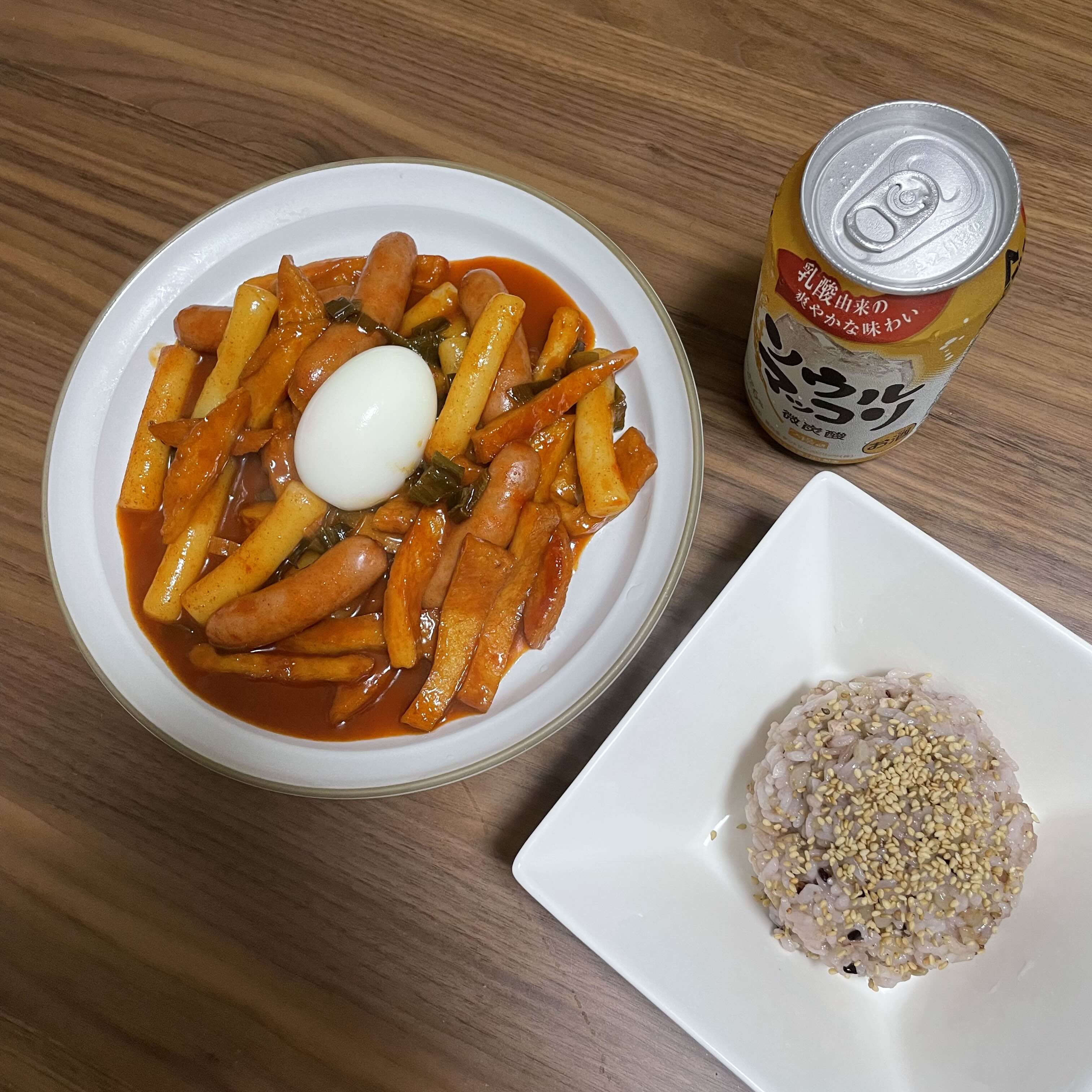 옛날 떡볶이 먹고 싶어서 떡볶이 만들어서 참치 주먹밥이랑 같이 먹었다.