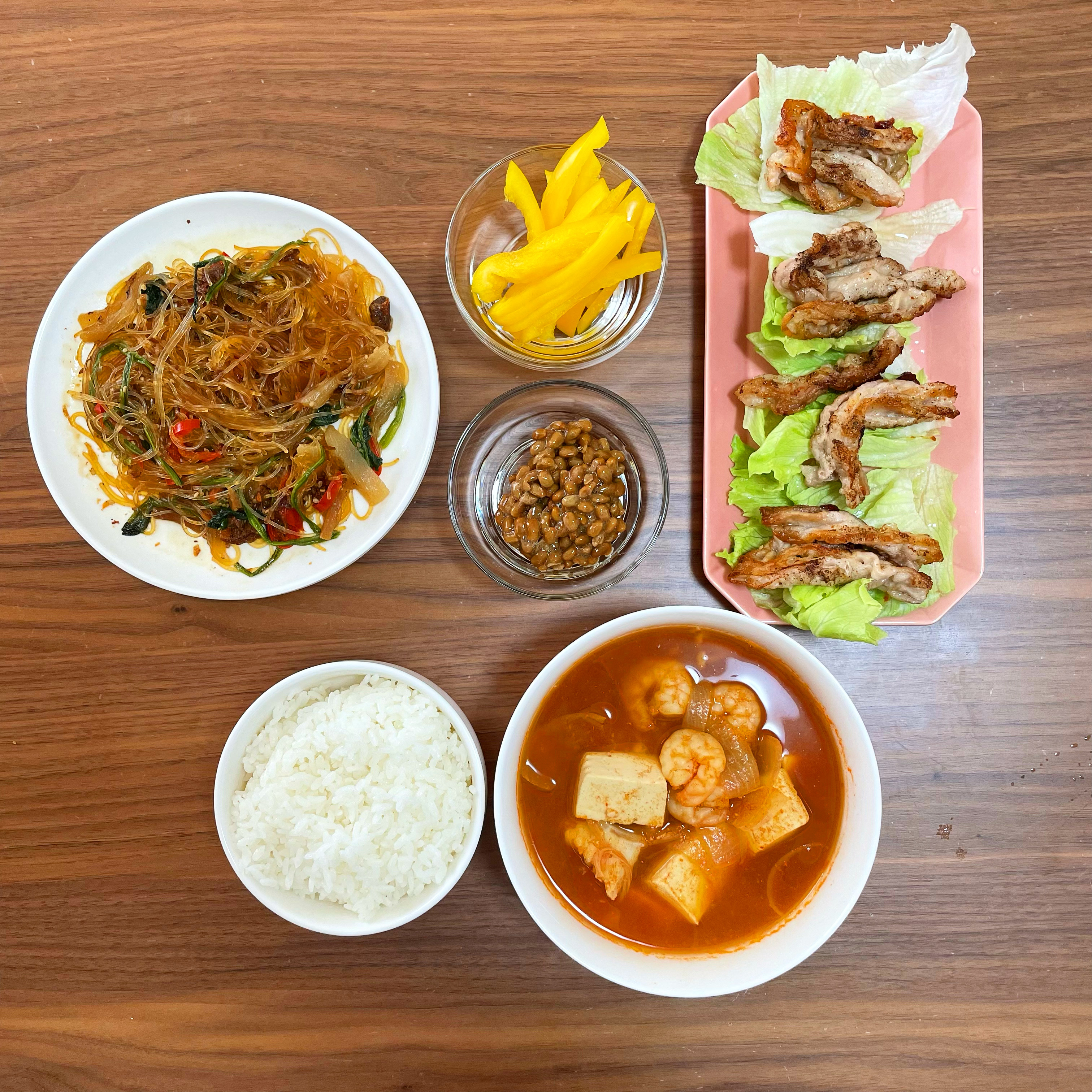 오랜만에 제대로 차려 먹었던 집밥. 잡채는 인스턴트지만~
