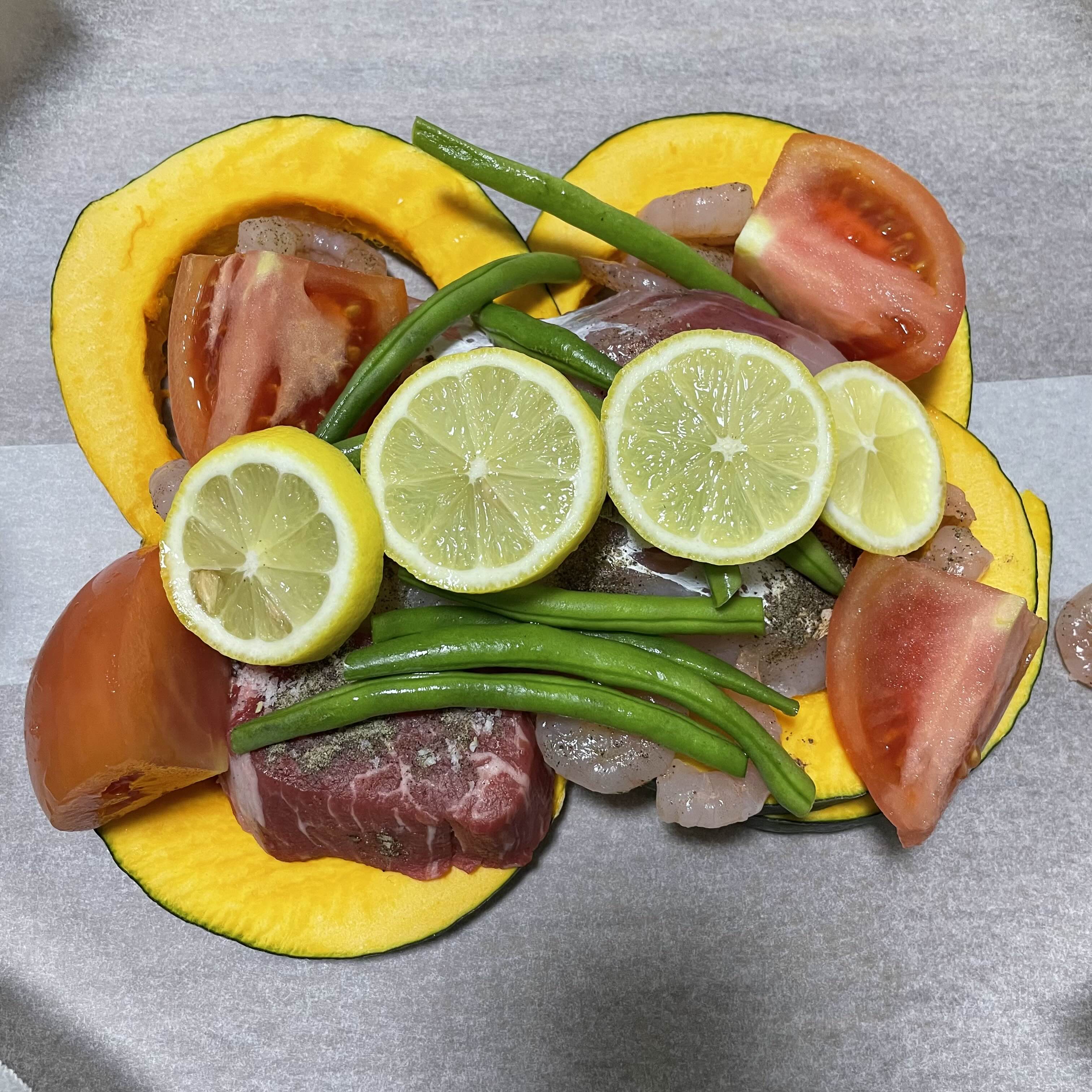 내가 준비한 재료는 단호박, 양파, 토마토, 콩줄기, 레몬, 대구살, 새우, 소고기.