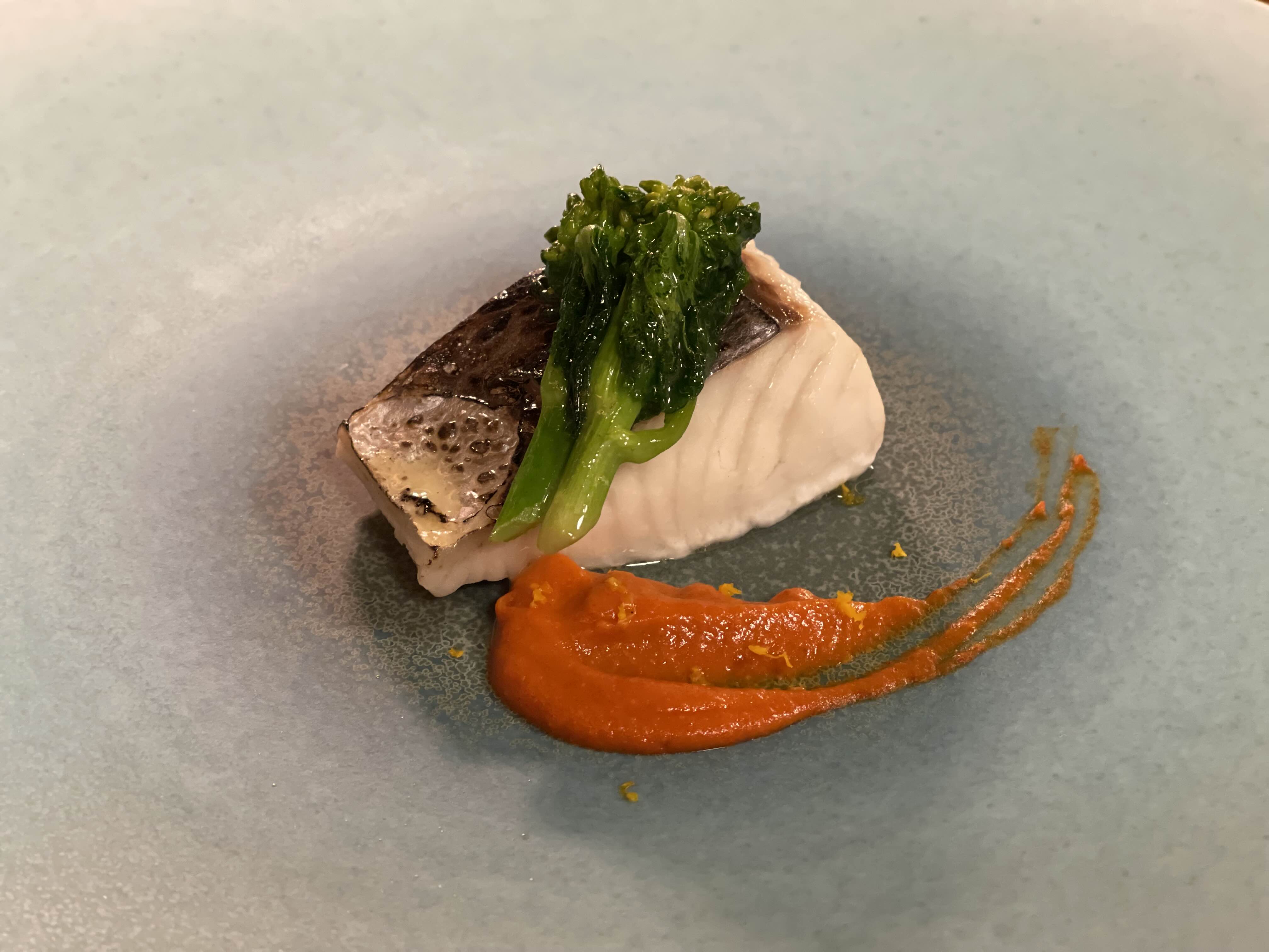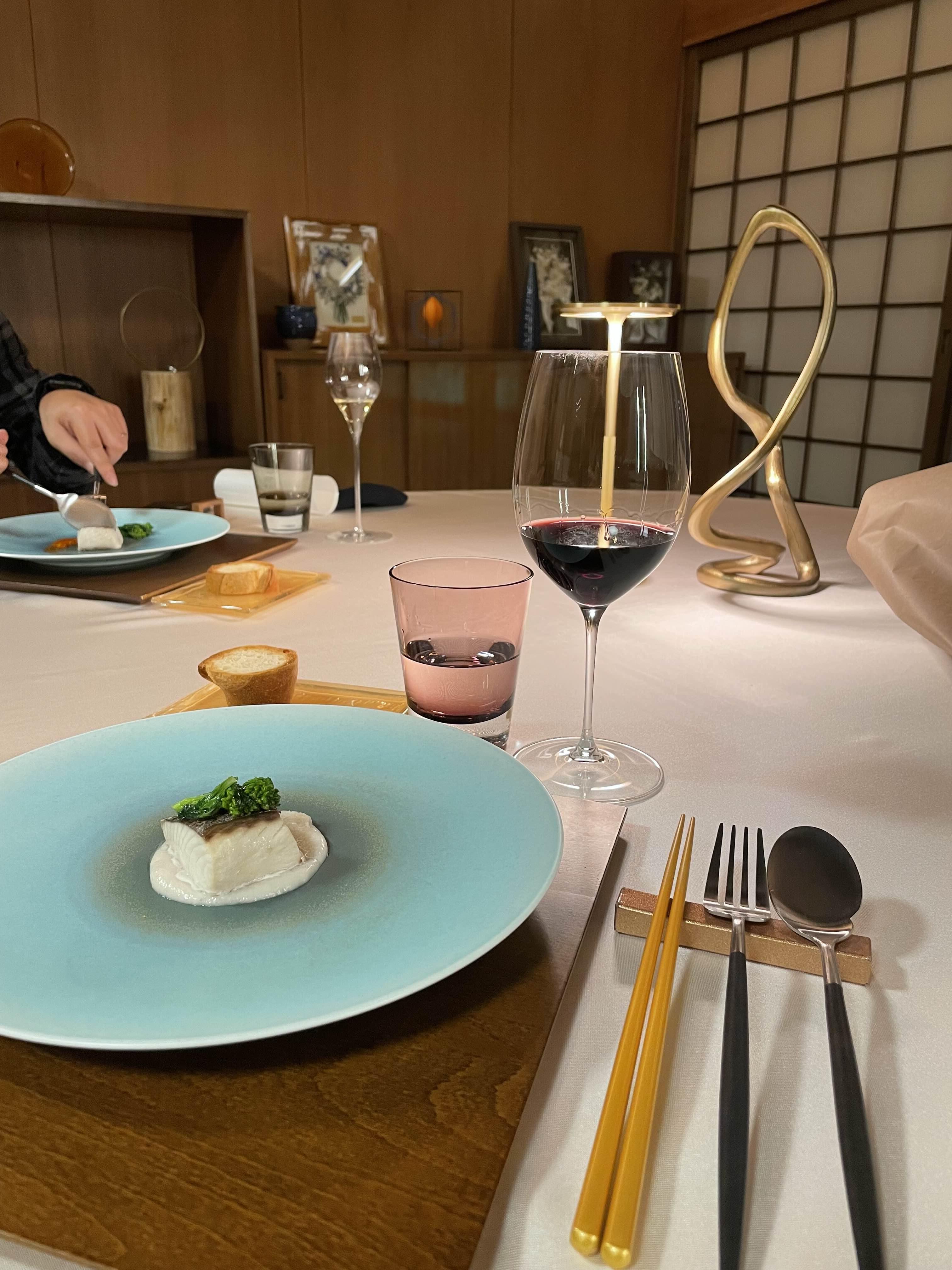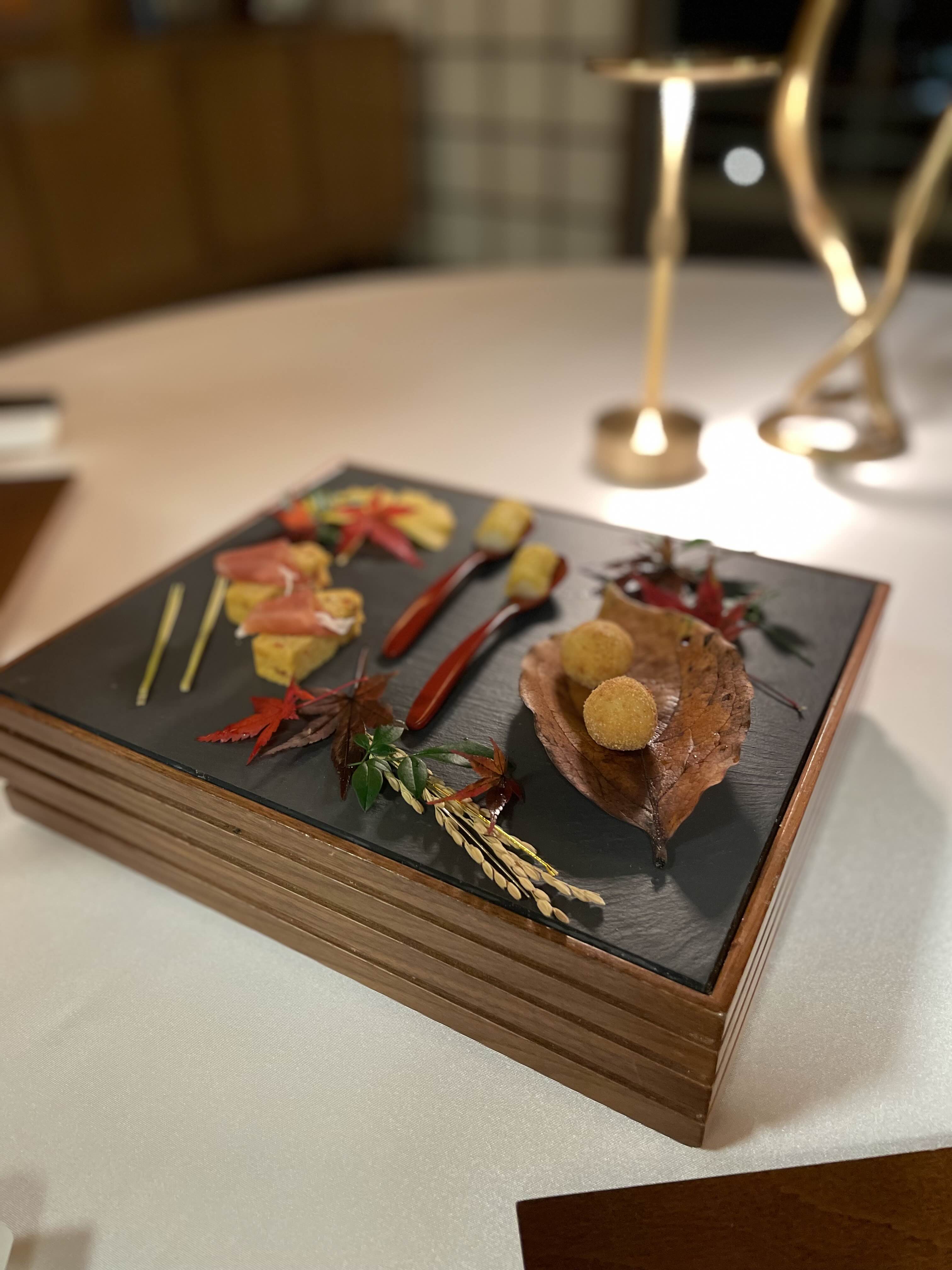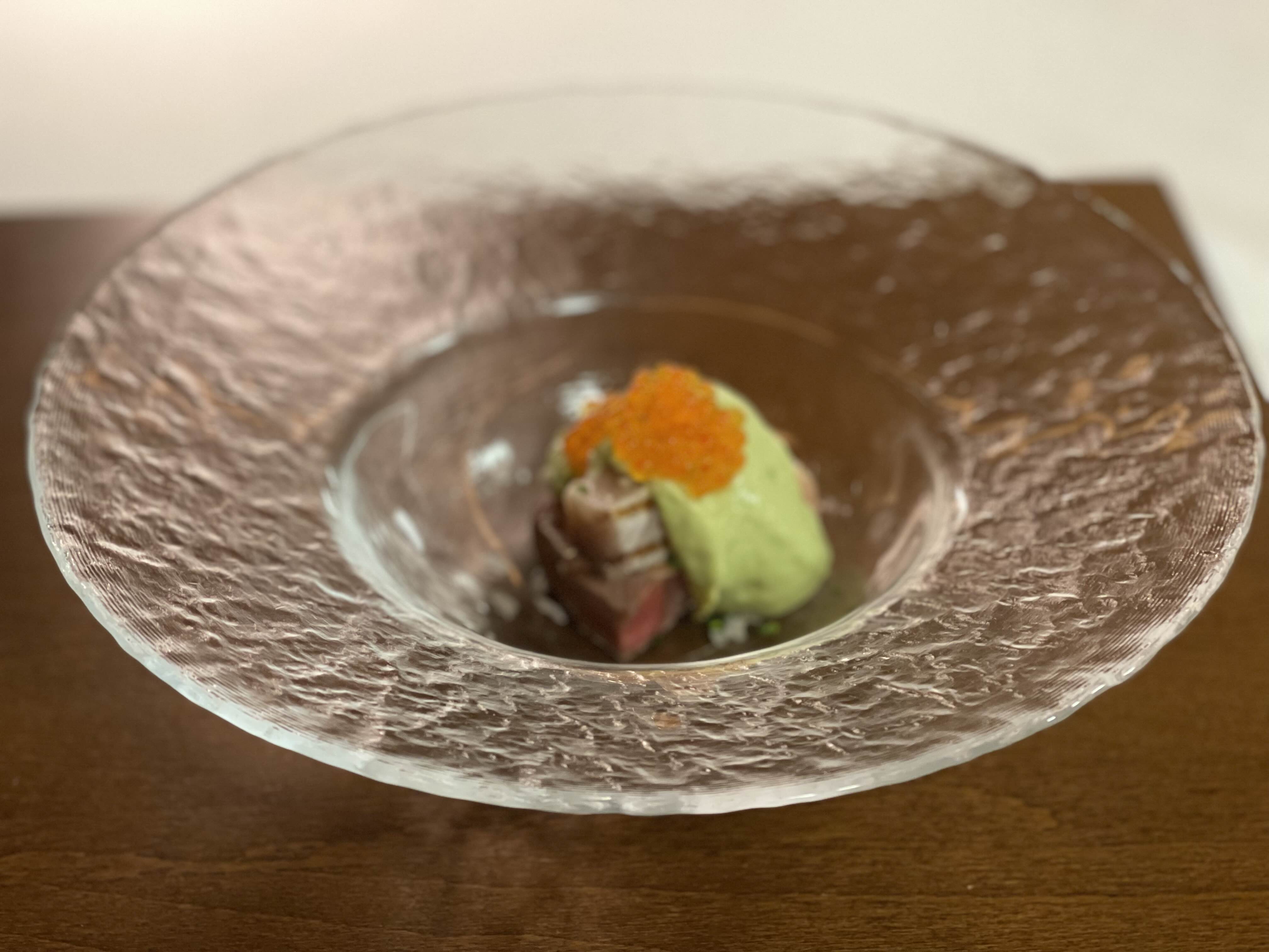 핑거 푸드는 햄이 올라간 파운드 케이크, 배추로 감싼 요리(안에 뭐 들었는지 까먹었다), 생선살이 들어간 한입 크기 고로케가 나왔다. 다음으로는 숙성시킨 회 위에 올라간 아보카도 소스. 회가 비싼 생선이라고 들었는데 이것도 뭔지 까먹었다.
