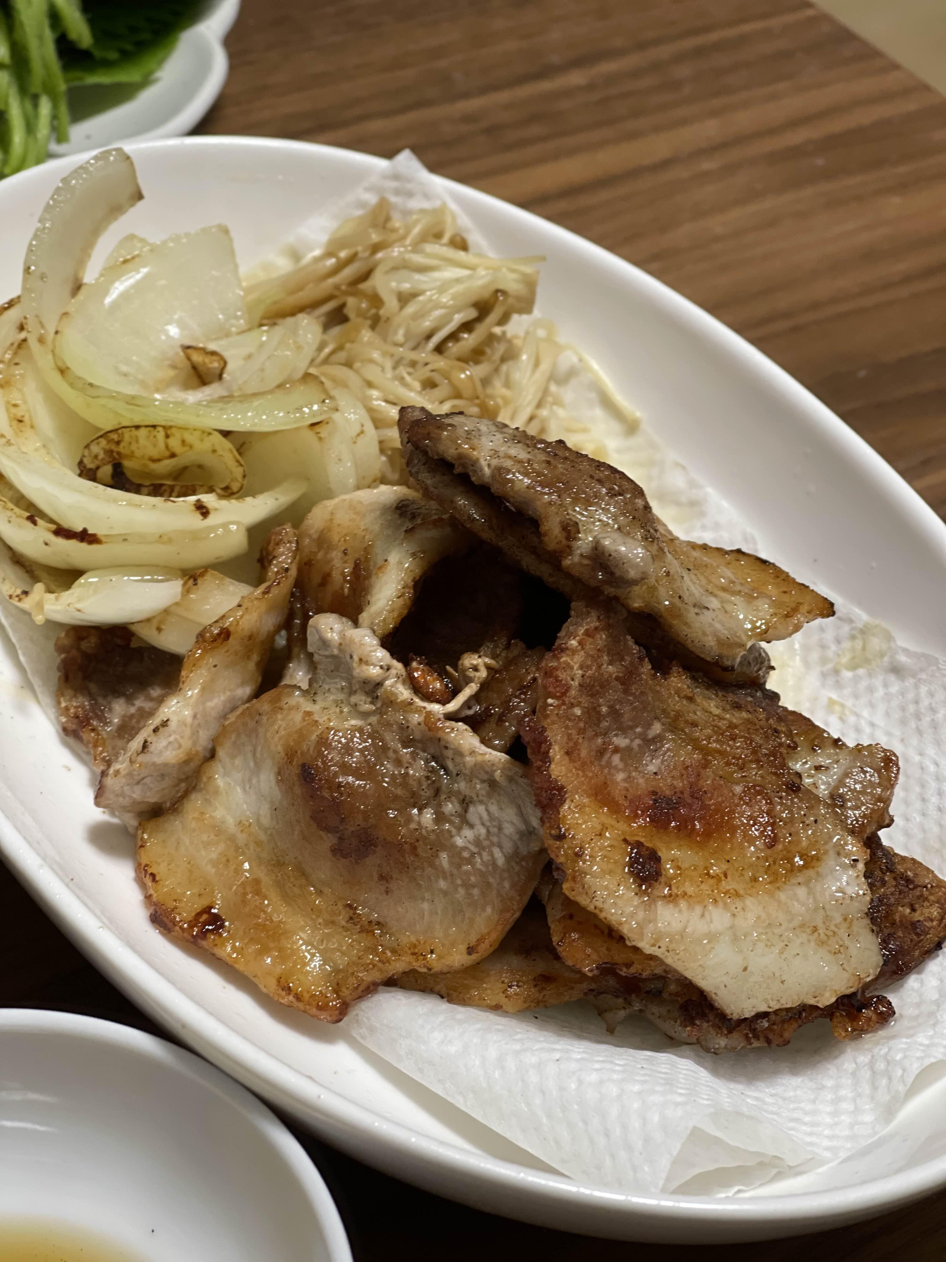 삼겹살이랑 버섯, 양파 같이 구워서 놓고 간사이 슈퍼에서 깻잎도 사와서 제대로 쌈 싸 먹었다.