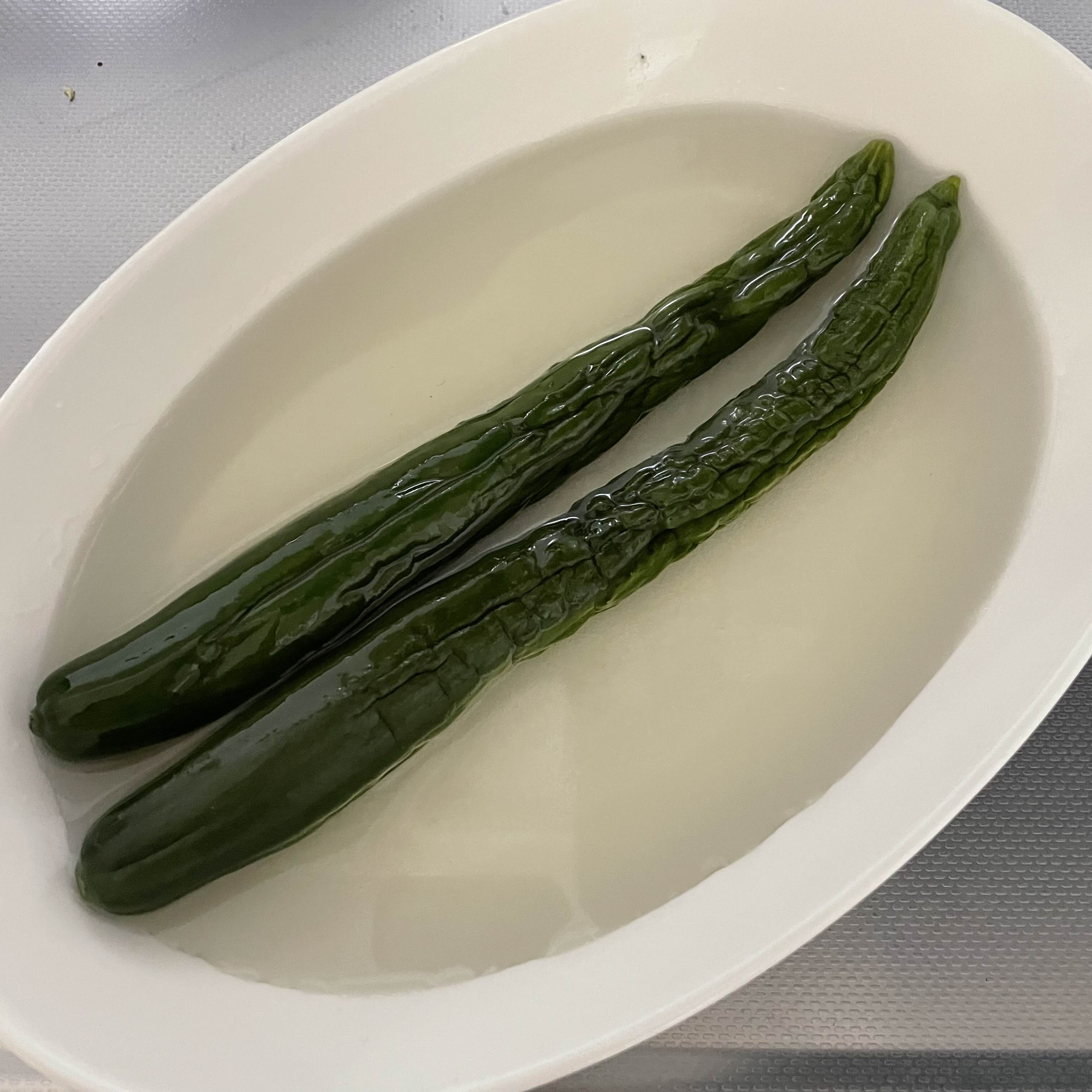 이렇게 오이지를 만들었으면 물에 십분 이상 담궈서 짠기를 빼주고 물기도 꼭 빼준다.