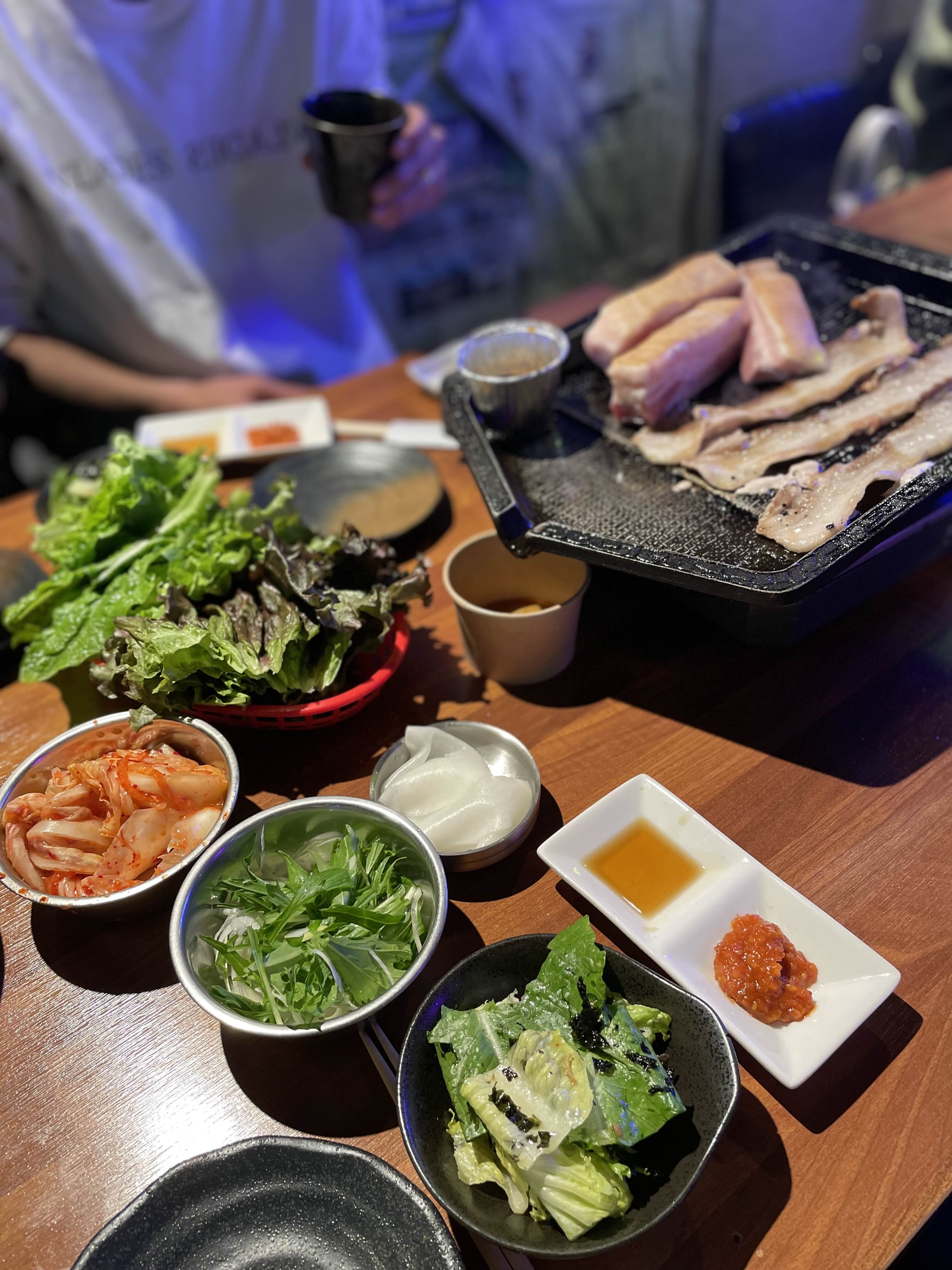 삼겹살 타베호다이를 시키면 기본적으로 삼겹살이랑 김치, 야채 등의 세팅이 나온다.