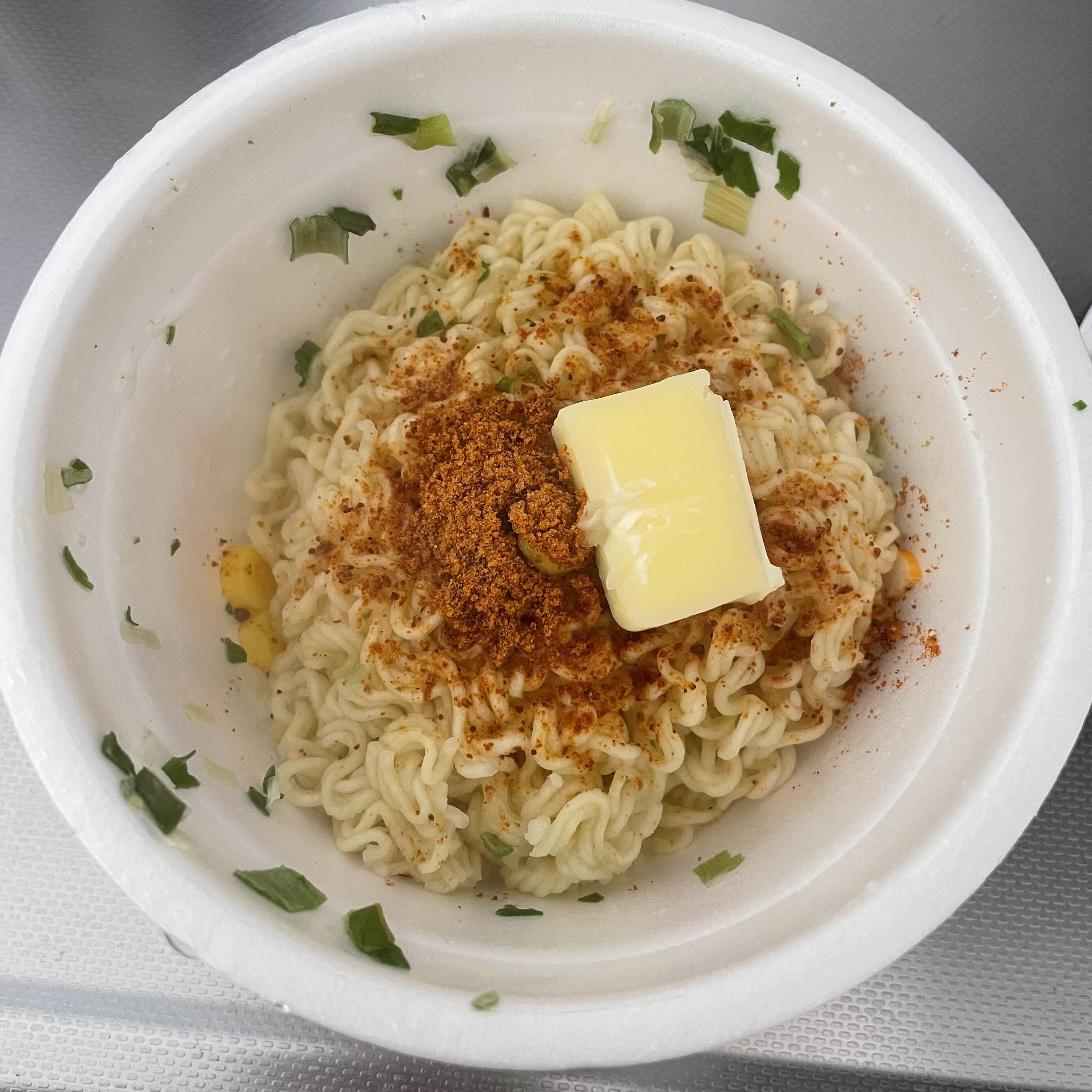 면을 익히고 뚜껑에 뽕뽕 구멍 내서 물 뺀다음에 버터 하나랑 스프 3분의 1 넣고 쉐킷 쉐킷 비벼준다.
