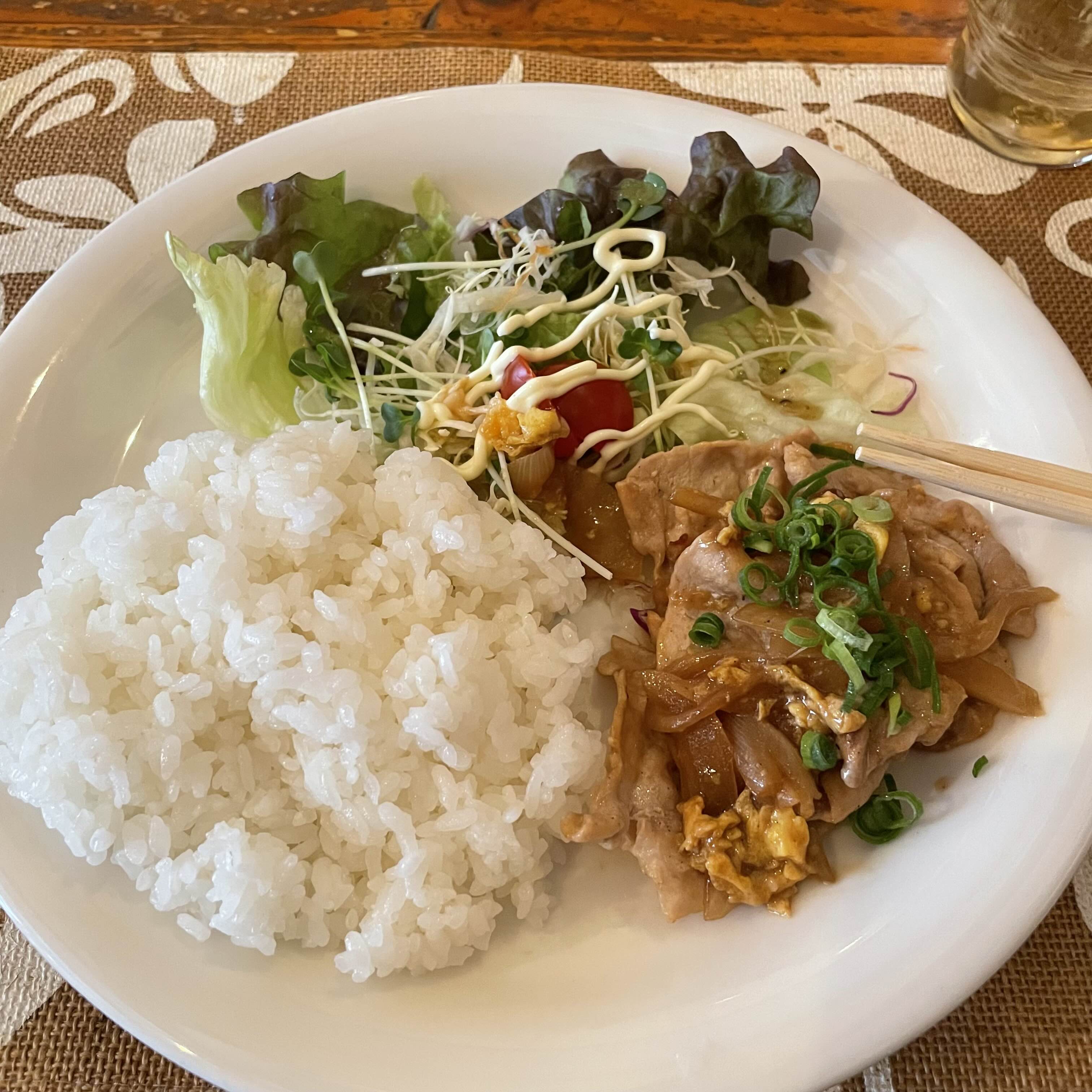 550엔의 아주 저렴한 가격에 원 플레이트에 밥, 고기 볶음, 샐러드가 나온다.