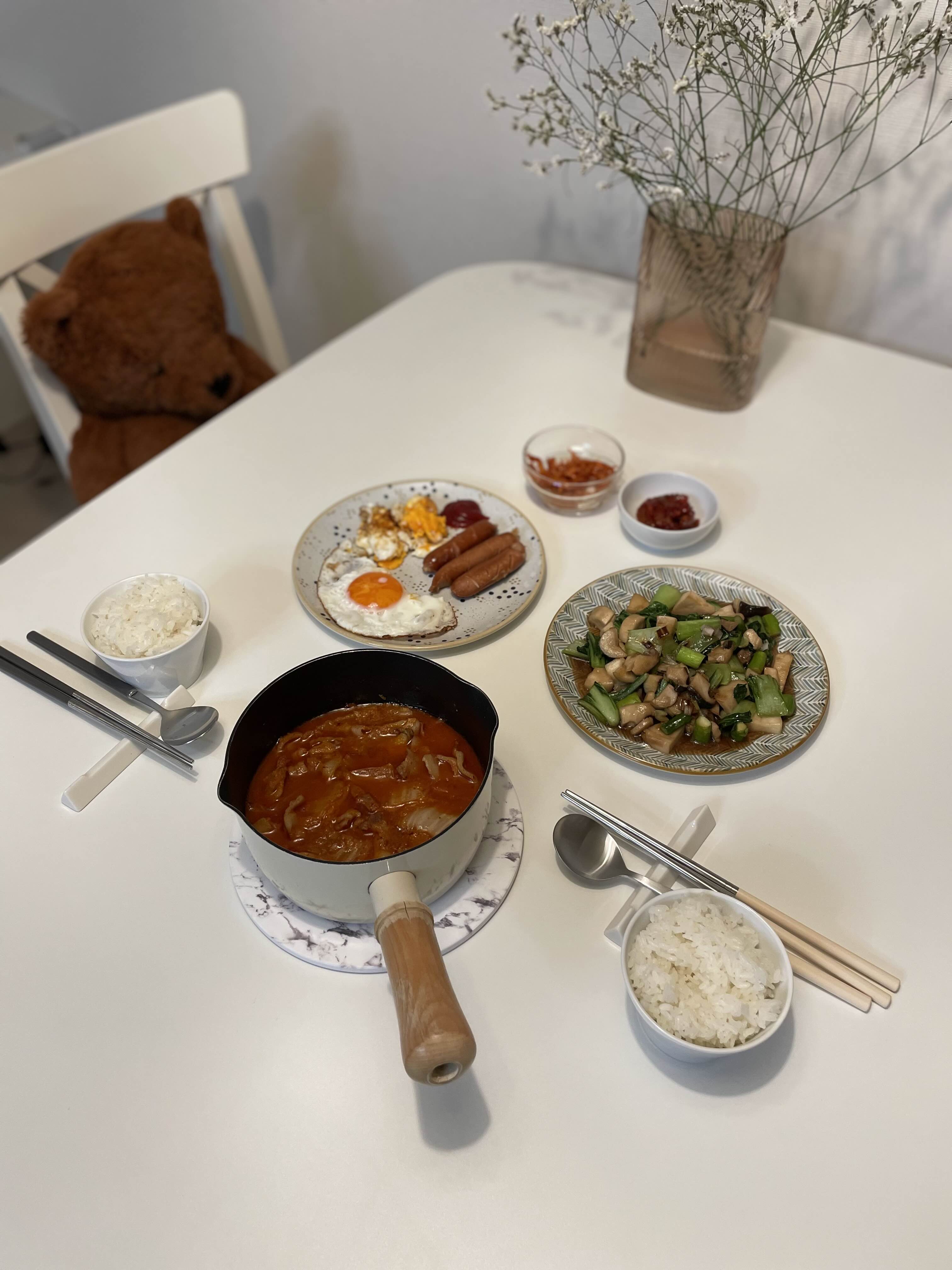 계속 밖에서 음식을 먹으니까 한국 요리 먹고 싶다고 해서 김치찌개랑 야채 볶음 만들어서
