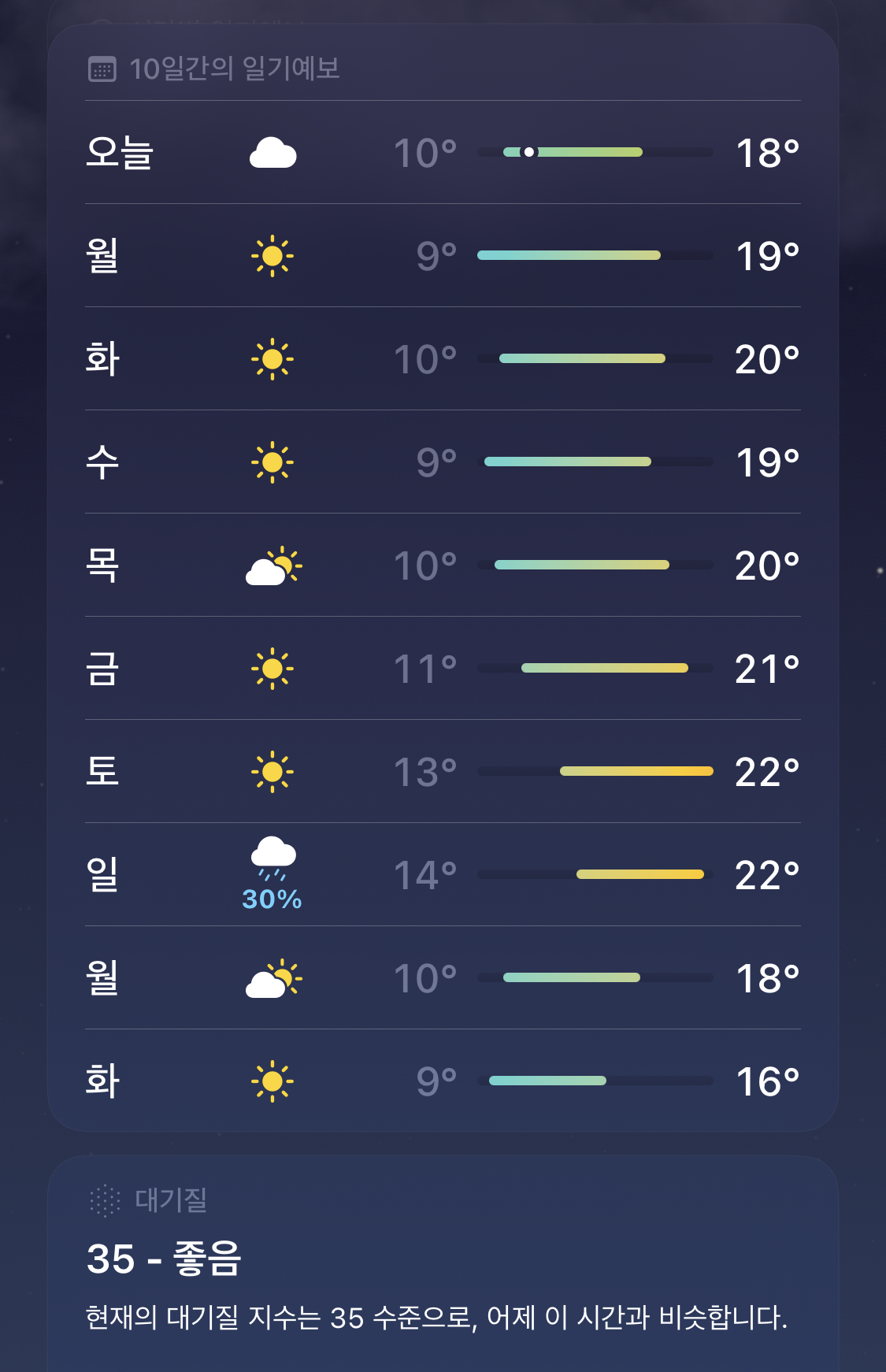 18,19도 정도의 기온이라 아침 저녁에만 쌀쌀한 정도인데 참 기분 좋은 날씨다.