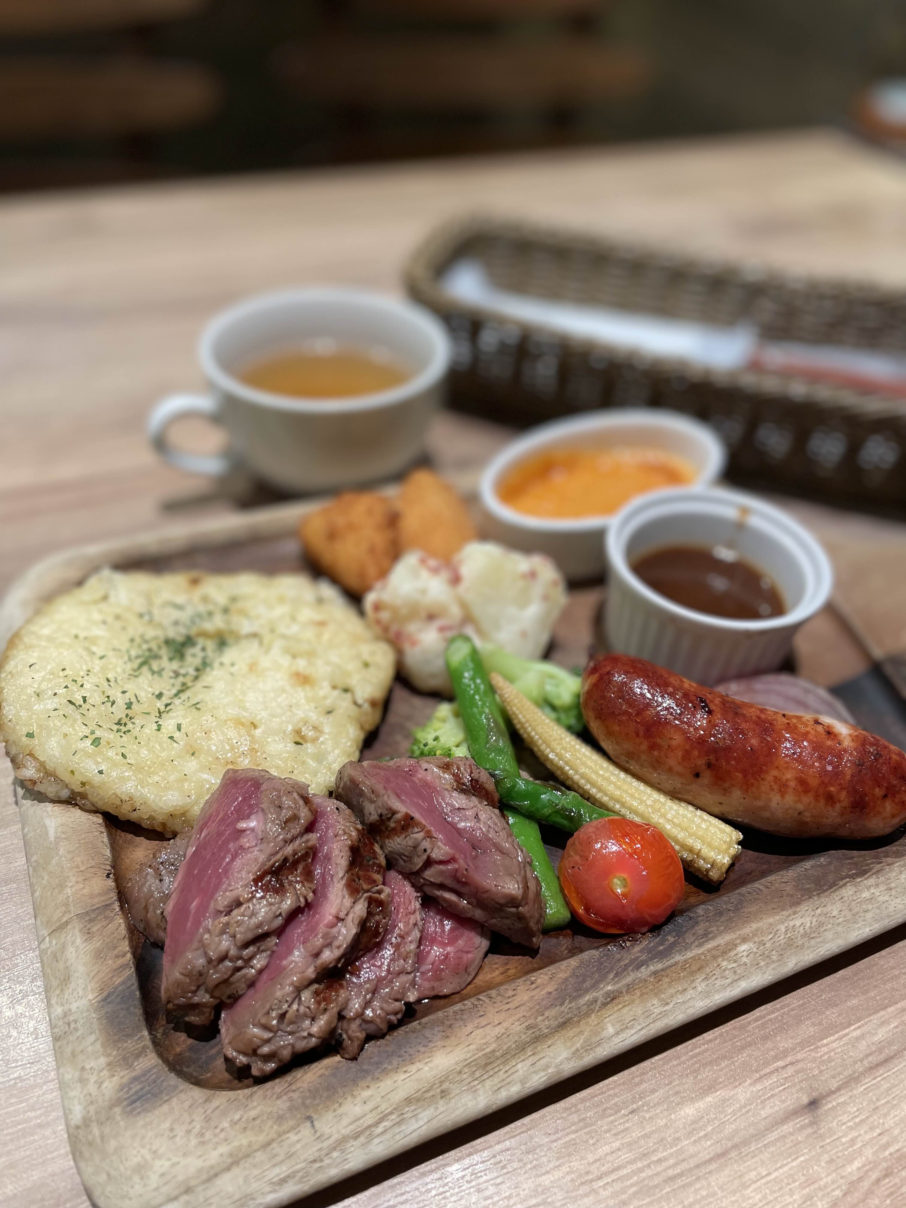 플레이트에 스테이크와 야채, 샐러드 등이 함께 나왔는데