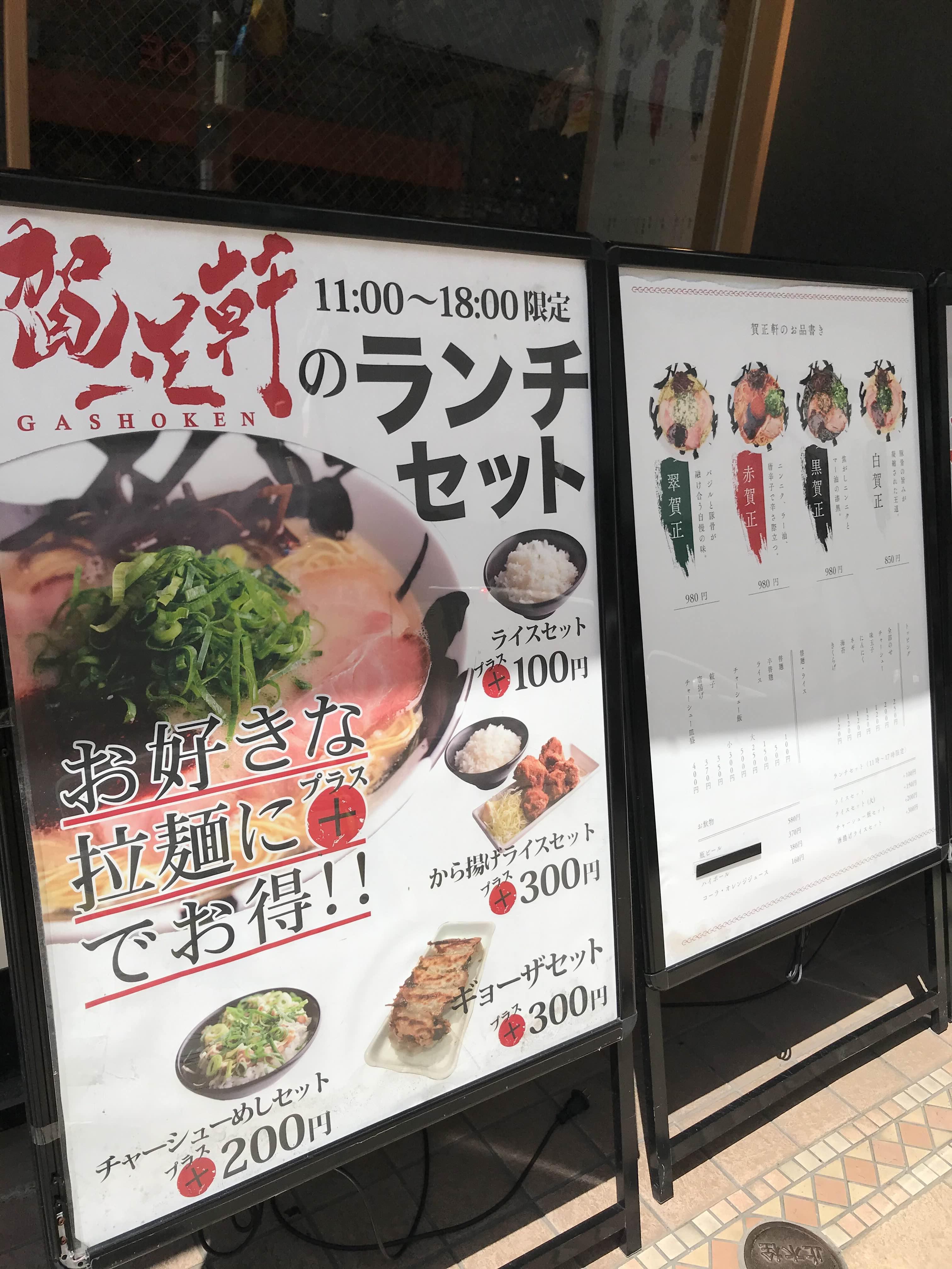 런치 세트로 (11시부터 저녁 6시까지) 밥은 100엔 추가, 차슈 덮밥은 200엔 추가, 교자 혹은 가라아게는 300엔 추가로 먹을 수 있다.