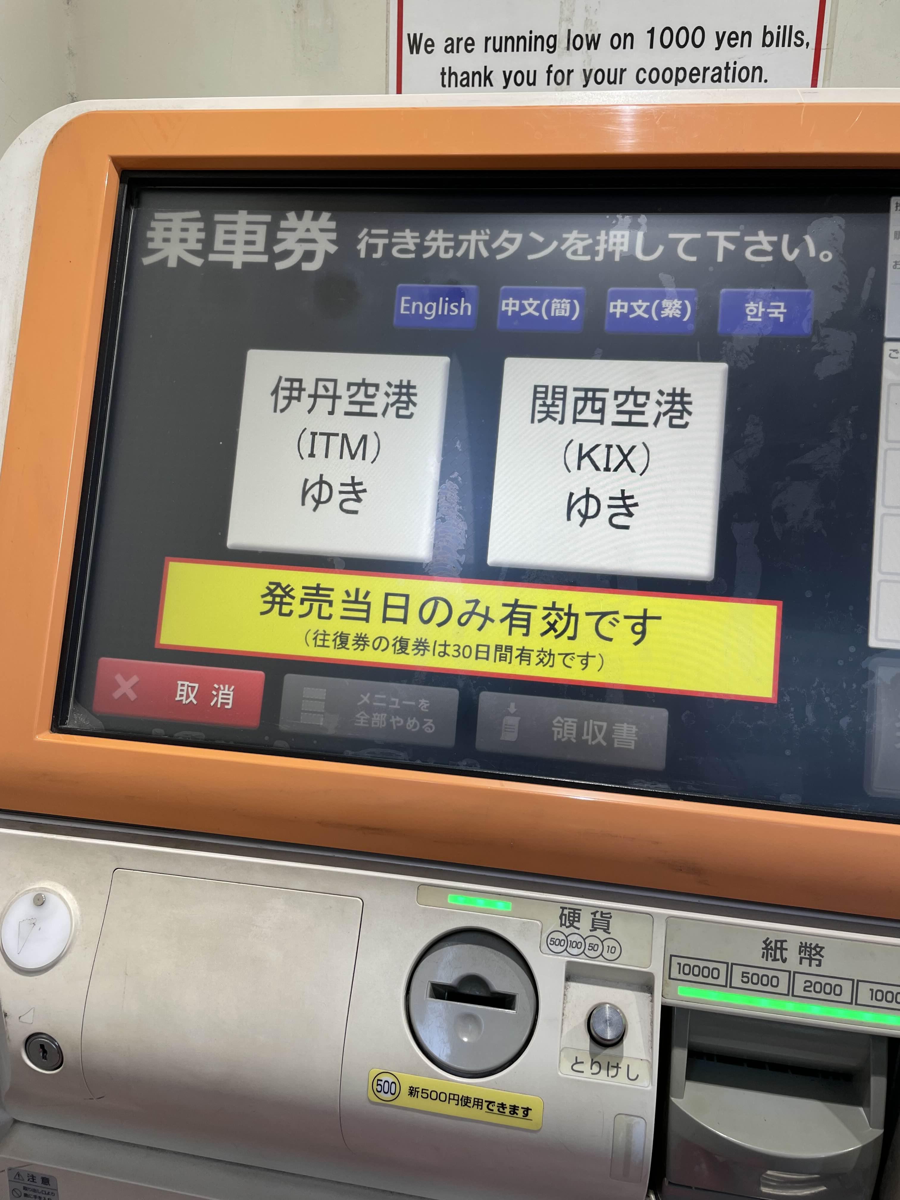티켓을 구매하러 가면 이타미 공항과 간사이 공항 가는 티켓 두가지 종류가 있기 때문에 절대 헷갈리면 안된다.