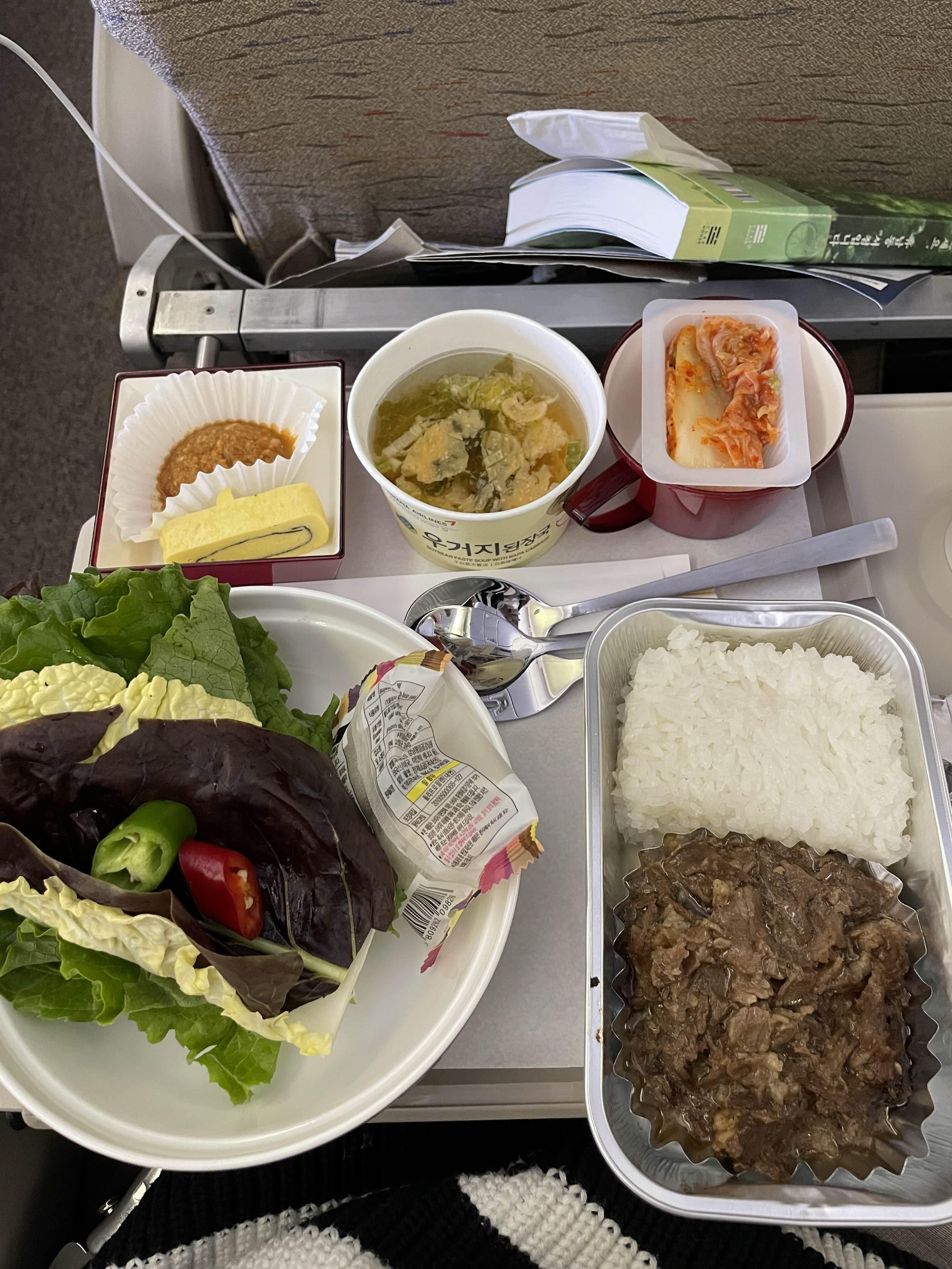 비행기가 뜨고나서 제일 먼저 나온 식사는 한식을 선택해서 불고기 쌈밥이 나왔다.