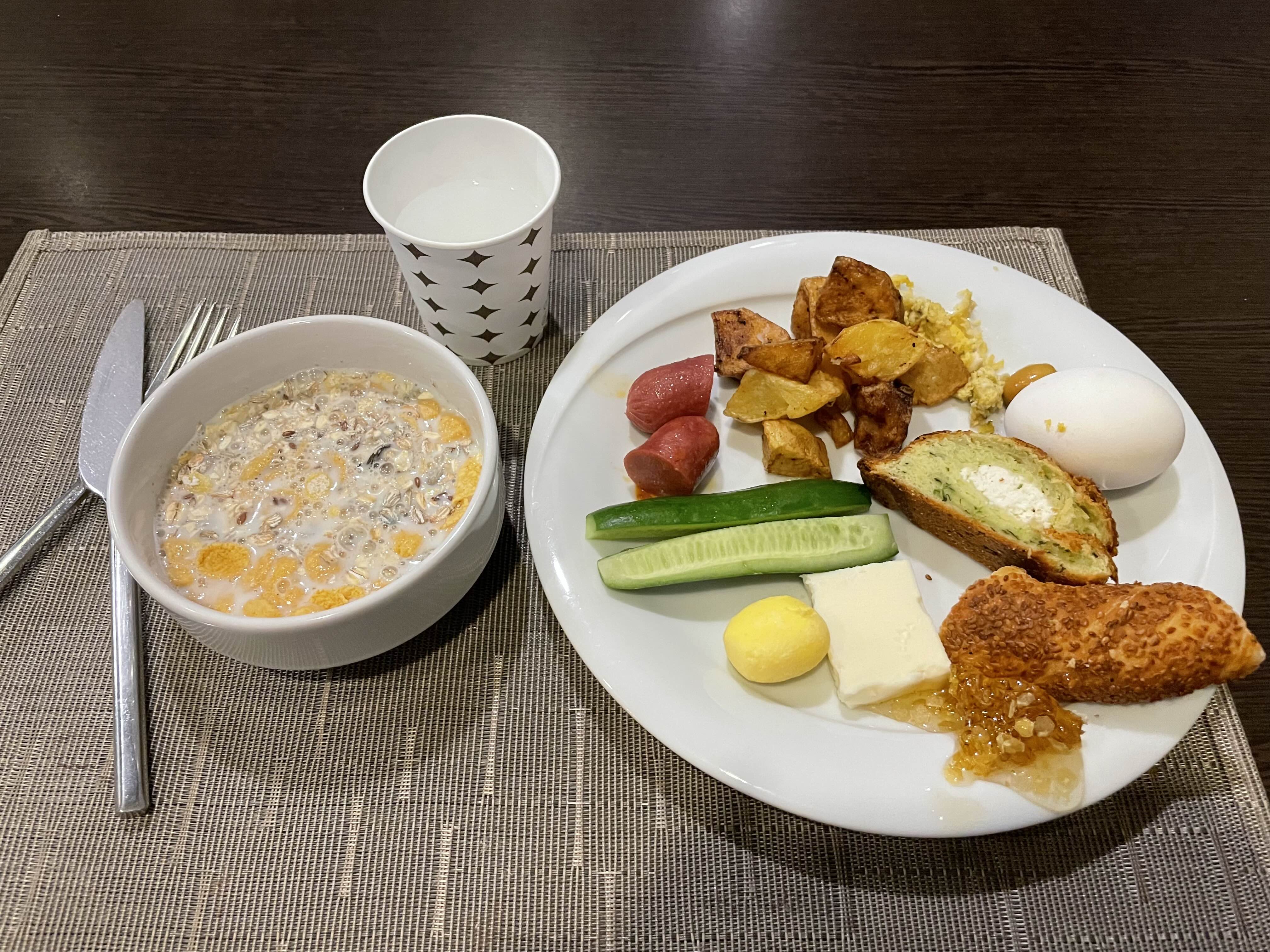 조식은 간단하게 시리얼이랑 계란, 감자튀김, 오이 같은 걸 먹었다.