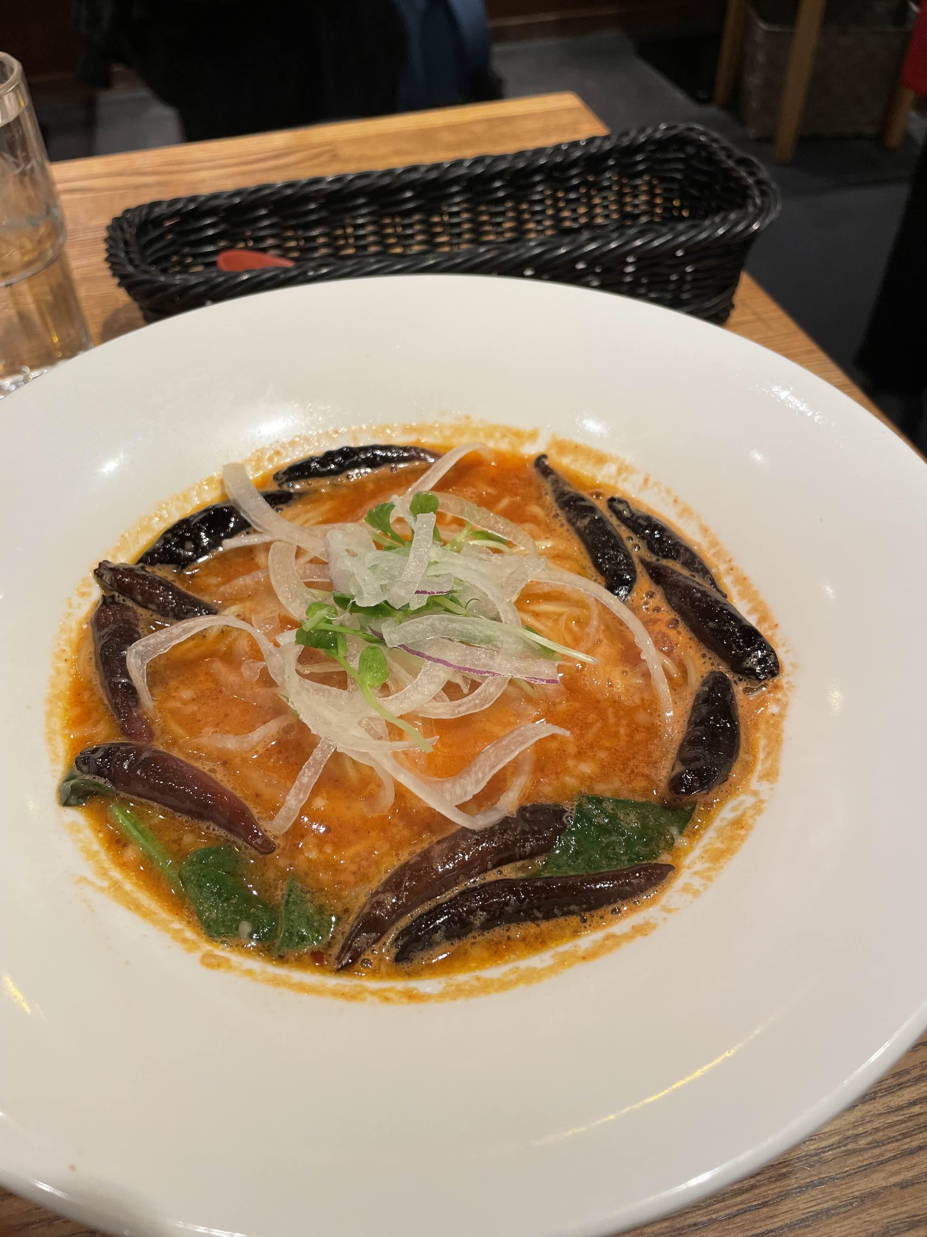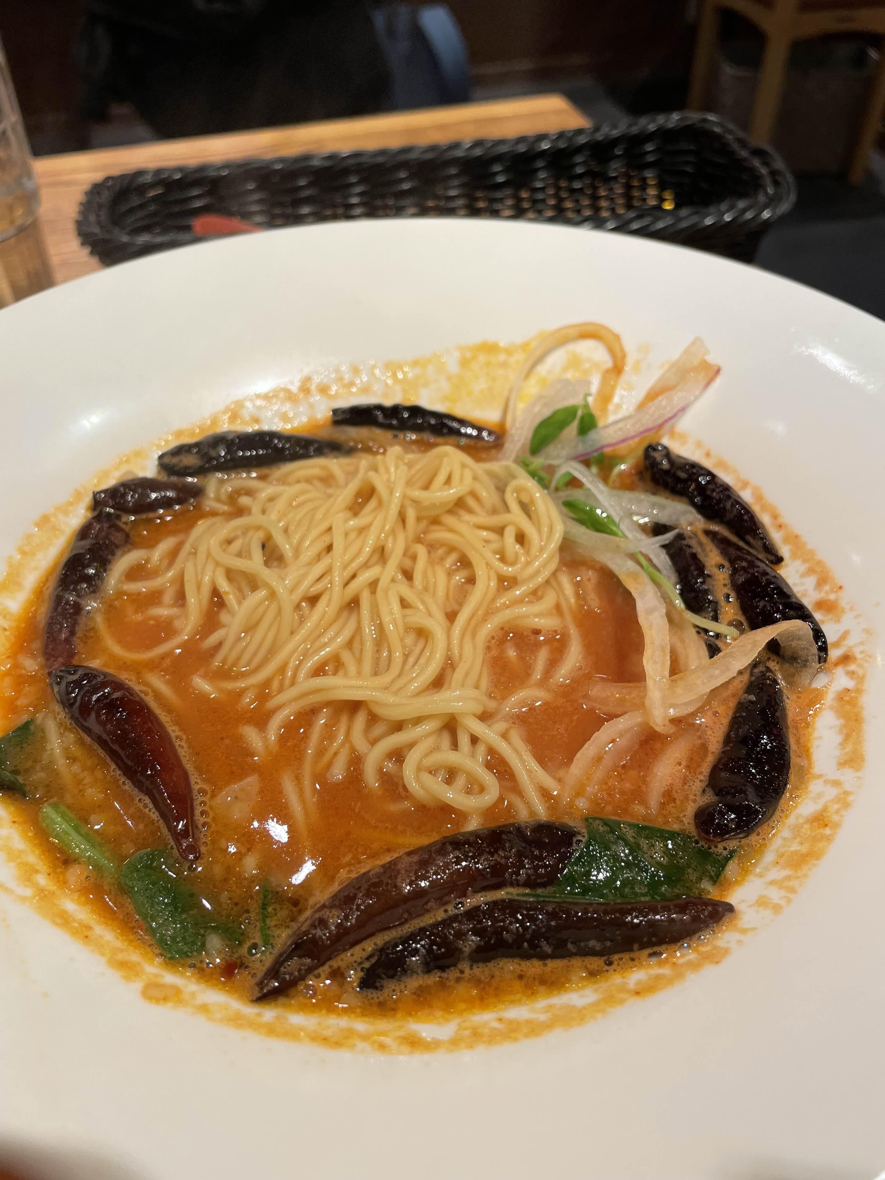 마른 고추가 떠 다니는 빨간 비주얼의 라멘이 등장했다.