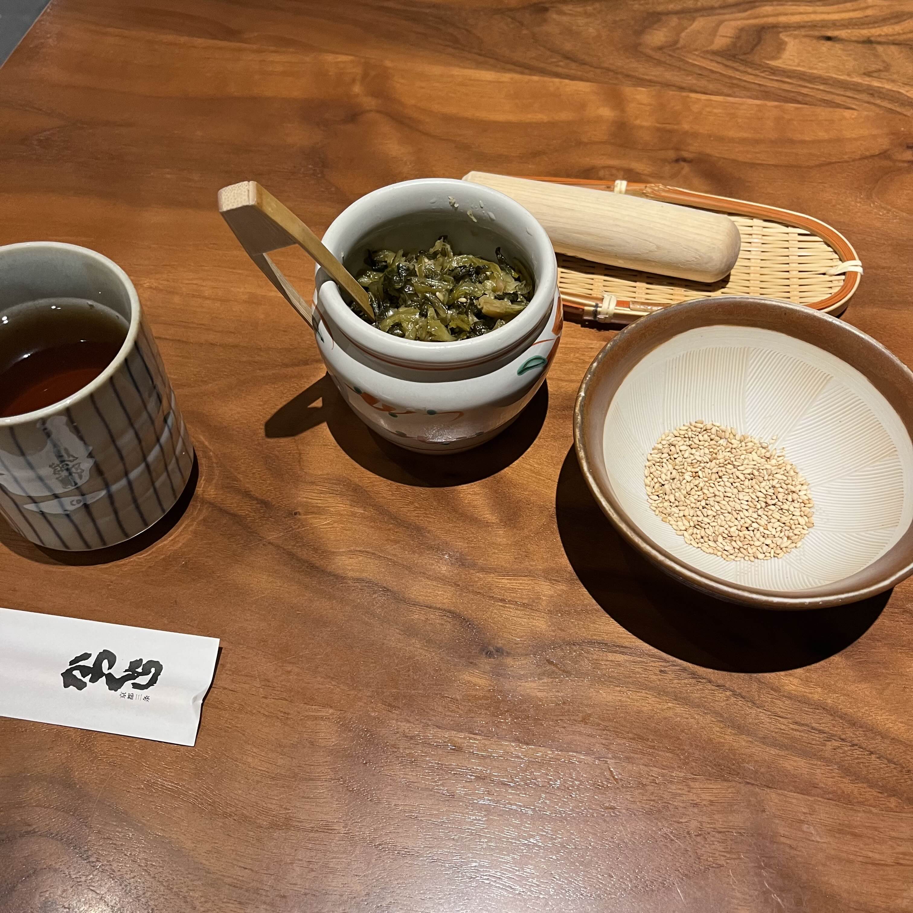음식을 주문하면 깨와 밑반찬인 갓나물을 가져다 주신다.
