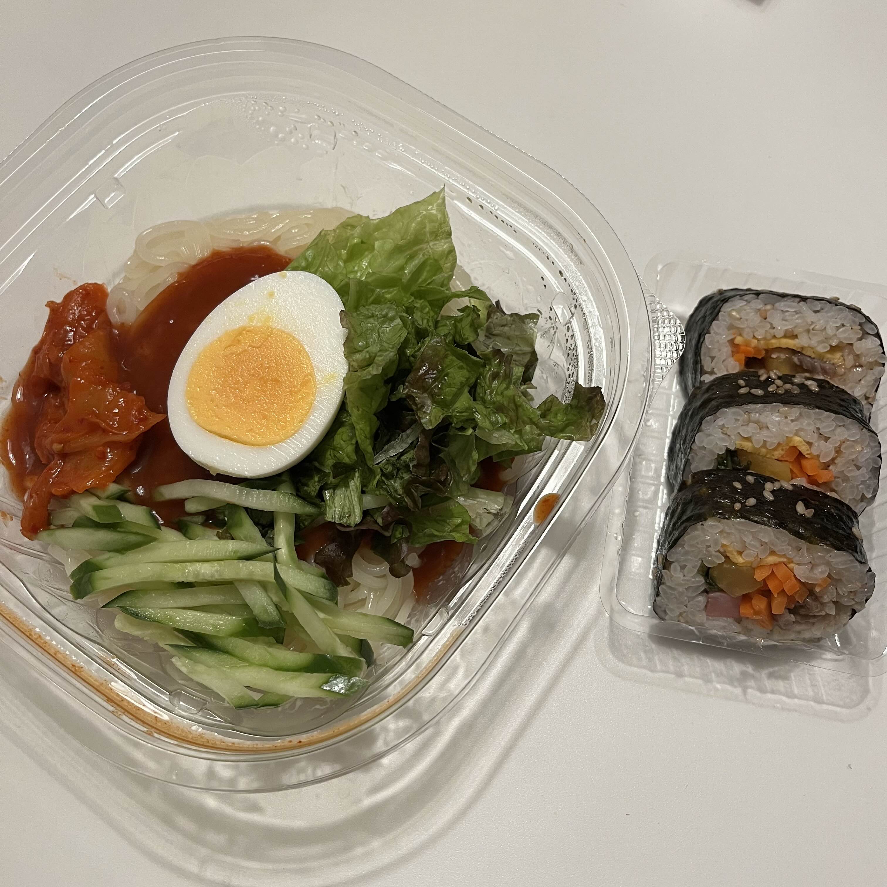 요즘 시원한 면요리가 먹고 싶을 때가 많았는데 딱 눈에 들어온 비빔냉면 ビビン冷麺 과 불고기 김밥 プルコギキムパ !